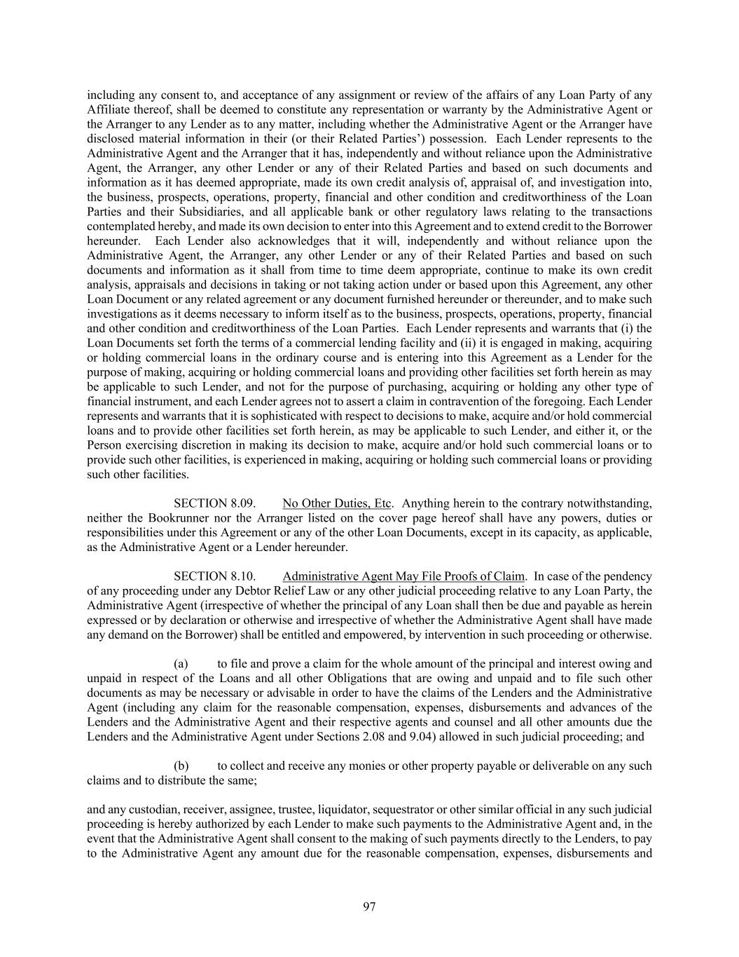 97 including any consent to, and acceptance of any assignment or review of the affairs of any Loan Party of any Affiliate thereof, shall be deemed to constitute any representation or warranty by the Administrative Agent or the Arranger to any Lender as to any matter, including whether the Administrative Agent or the Arranger have disclosed material information in their (or their Related Parties’) possession. Each Lender represents to the Administrative Agent and the Arranger that it has, independently and without reliance upon the Administrative Agent, the Arranger, any other Lender or any of their Related Parties and based on such documents and information as it has deemed appropriate, made its own credit analysis of, appraisal of, and investigation into, the business, prospects, operations, property, financial and other condition and creditworthiness of the Loan Parties and their Subsidiaries, and all applicable bank or other regulatory laws relating to the transactions contemplated hereby, and made its own decision to enter into this Agreement and to extend credit to the Borrower hereunder. Each Lender also acknowledges that it will, independently and without reliance upon the Administrative Agent, the Arranger, any other Lender or any of their Related Parties and based on such documents and information as it shall from time to time deem appropriate, continue to make its own credit analysis, appraisals and decisions in taking or not taking action under or based upon this Agreement, any other Loan Document or any related agreement or any document furnished hereunder or thereunder, and to make such investigations as it deems necessary to inform itself as to the business, prospects, operations, property, financial and other condition and creditworthiness of the Loan Parties. Each Lender represents and warrants that (i) the Loan Documents set forth the terms of a commercial lending facility and (ii) it is engaged in making, acquiring or holding commercial loans in the ordinary course and is entering into this Agreement as a Lender for the purpose of making, acquiring or holding commercial loans and providing other facilities set forth herein as may be applicable to such Lender, and not for the purpose of purchasing, acquiring or holding any other type of financial instrument, and each Lender agrees not to assert a claim in contravention of the foregoing. Each Lender represents and warrants that it is sophisticated with respect to decisions to make, acquire and/or hold commercial loans and to provide other facilities set forth herein, as may be applicable to such Lender, and either it, or the Person exercising discretion in making its decision to make, acquire and/or hold such commercial loans or to provide such other facilities, is experienced in making, acquiring or holding such commercial loans or providing such other facilities. SECTION 8.09. No Other Duties, Etc. Anything herein to the contrary notwithstanding, neither the Bookrunner nor the Arranger listed on the cover page hereof shall have any powers, duties or responsibilities under this Agreement or any of the other Loan Documents, except in its capacity, as applicable, as the Administrative Agent or a Lender hereunder. SECTION 8.10. Administrative Agent May File Proofs of Claim. In case of the pendency of any proceeding under any Debtor Relief Law or any other judicial proceeding relative to any Loan Party, the Administrative Agent (irrespective of whether the principal of any Loan shall then be due and payable as herein expressed or by declaration or otherwise and irrespective of whether the Administrative Agent shall have made any demand on the Borrower) shall be entitled and empowered, by intervention in such proceeding or otherwise. (a) to file and prove a claim for the whole amount of the principal and interest owing and unpaid in respect of the Loans and all other Obligations that are owing and unpaid and to file such other documents as may be necessary or advisable in order to have the claims of the Lenders and the Administrative Agent (including any claim for the reasonable compensation, expenses, disbursements and advances of the Lenders and the Administrative Agent and their respective agents and counsel and all other amounts due the Lenders and the Administrative Agent under Sections 2.08 and 9.04) allowed in such judicial proceeding; and (b) to collect and receive any monies or other property payable or deliverable on any such claims and to distribute the same; and any custodian, receiver, assignee, trustee, liquidator, sequestrator or other similar official in any such judicial proceeding is hereby authorized by each Lender to make such payments to the Administrative Agent and, in the event that the Administrative Agent shall consent to the making of such payments directly to the Lenders, to pay to the Administrative Agent any amount due for the reasonable compensation, expenses, disbursements and
