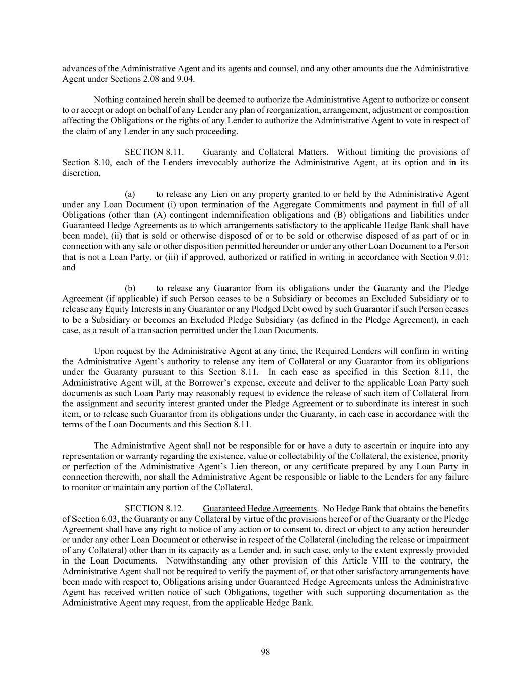 98 advances of the Administrative Agent and its agents and counsel, and any other amounts due the Administrative Agent under Sections 2.08 and 9.04. Nothing contained herein shall be deemed to authorize the Administrative Agent to authorize or consent to or accept or adopt on behalf of any Lender any plan of reorganization, arrangement, adjustment or composition affecting the Obligations or the rights of any Lender to authorize the Administrative Agent to vote in respect of the claim of any Lender in any such proceeding. SECTION 8.11. Guaranty and Collateral Matters. Without limiting the provisions of Section 8.10, each of the Lenders irrevocably authorize the Administrative Agent, at its option and in its discretion, (a) to release any Lien on any property granted to or held by the Administrative Agent under any Loan Document (i) upon termination of the Aggregate Commitments and payment in full of all Obligations (other than (A) contingent indemnification obligations and (B) obligations and liabilities under Guaranteed Hedge Agreements as to which arrangements satisfactory to the applicable Hedge Bank shall have been made), (ii) that is sold or otherwise disposed of or to be sold or otherwise disposed of as part of or in connection with any sale or other disposition permitted hereunder or under any other Loan Document to a Person that is not a Loan Party, or (iii) if approved, authorized or ratified in writing in accordance with Section 9.01; and (b) to release any Guarantor from its obligations under the Guaranty and the Pledge Agreement (if applicable) if such Person ceases to be a Subsidiary or becomes an Excluded Subsidiary or to release any Equity Interests in any Guarantor or any Pledged Debt owed by such Guarantor if such Person ceases to be a Subsidiary or becomes an Excluded Pledge Subsidiary (as defined in the Pledge Agreement), in each case, as a result of a transaction permitted under the Loan Documents. Upon request by the Administrative Agent at any time, the Required Lenders will confirm in writing the Administrative Agent’s authority to release any item of Collateral or any Guarantor from its obligations under the Guaranty pursuant to this Section 8.11. In each case as specified in this Section 8.11, the Administrative Agent will, at the Borrower’s expense, execute and deliver to the applicable Loan Party such documents as such Loan Party may reasonably request to evidence the release of such item of Collateral from the assignment and security interest granted under the Pledge Agreement or to subordinate its interest in such item, or to release such Guarantor from its obligations under the Guaranty, in each case in accordance with the terms of the Loan Documents and this Section 8.11. The Administrative Agent shall not be responsible for or have a duty to ascertain or inquire into any representation or warranty regarding the existence, value or collectability of the Collateral, the existence, priority or perfection of the Administrative Agent’s Lien thereon, or any certificate prepared by any Loan Party in connection therewith, nor shall the Administrative Agent be responsible or liable to the Lenders for any failure to monitor or maintain any portion of the Collateral. SECTION 8.12. Guaranteed Hedge Agreements. No Hedge Bank that obtains the benefits of Section 6.03, the Guaranty or any Collateral by virtue of the provisions hereof or of the Guaranty or the Pledge Agreement shall have any right to notice of any action or to consent to, direct or object to any action hereunder or under any other Loan Document or otherwise in respect of the Collateral (including the release or impairment of any Collateral) other than in its capacity as a Lender and, in such case, only to the extent expressly provided in the Loan Documents. Notwithstanding any other provision of this Article VIII to the contrary, the Administrative Agent shall not be required to verify the payment of, or that other satisfactory arrangements have been made with respect to, Obligations arising under Guaranteed Hedge Agreements unless the Administrative Agent has received written notice of such Obligations, together with such supporting documentation as the Administrative Agent may request, from the applicable Hedge Bank.