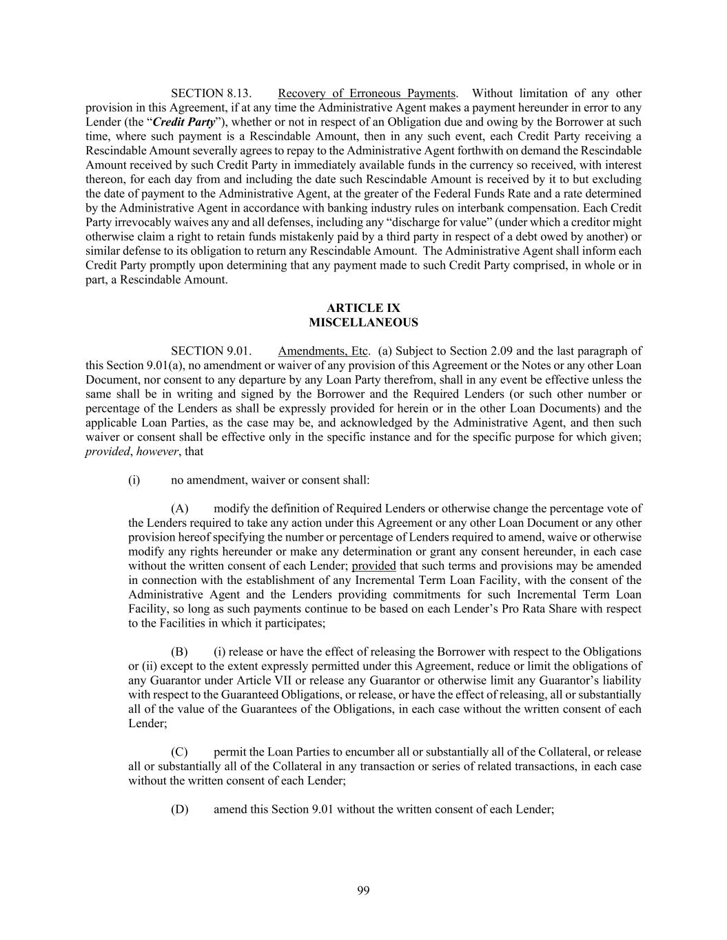 99 SECTION 8.13. Recovery of Erroneous Payments. Without limitation of any other provision in this Agreement, if at any time the Administrative Agent makes a payment hereunder in error to any Lender (the “Credit Party”), whether or not in respect of an Obligation due and owing by the Borrower at such time, where such payment is a Rescindable Amount, then in any such event, each Credit Party receiving a Rescindable Amount severally agrees to repay to the Administrative Agent forthwith on demand the Rescindable Amount received by such Credit Party in immediately available funds in the currency so received, with interest thereon, for each day from and including the date such Rescindable Amount is received by it to but excluding the date of payment to the Administrative Agent, at the greater of the Federal Funds Rate and a rate determined by the Administrative Agent in accordance with banking industry rules on interbank compensation. Each Credit Party irrevocably waives any and all defenses, including any “discharge for value” (under which a creditor might otherwise claim a right to retain funds mistakenly paid by a third party in respect of a debt owed by another) or similar defense to its obligation to return any Rescindable Amount. The Administrative Agent shall inform each Credit Party promptly upon determining that any payment made to such Credit Party comprised, in whole or in part, a Rescindable Amount. ARTICLE IX MISCELLANEOUS SECTION 9.01. Amendments, Etc. (a) Subject to Section 2.09 and the last paragraph of this Section 9.01(a), no amendment or waiver of any provision of this Agreement or the Notes or any other Loan Document, nor consent to any departure by any Loan Party therefrom, shall in any event be effective unless the same shall be in writing and signed by the Borrower and the Required Lenders (or such other number or percentage of the Lenders as shall be expressly provided for herein or in the other Loan Documents) and the applicable Loan Parties, as the case may be, and acknowledged by the Administrative Agent, and then such waiver or consent shall be effective only in the specific instance and for the specific purpose for which given; provided, however, that (i) no amendment, waiver or consent shall: (A) modify the definition of Required Lenders or otherwise change the percentage vote of the Lenders required to take any action under this Agreement or any other Loan Document or any other provision hereof specifying the number or percentage of Lenders required to amend, waive or otherwise modify any rights hereunder or make any determination or grant any consent hereunder, in each case without the written consent of each Lender; provided that such terms and provisions may be amended in connection with the establishment of any Incremental Term Loan Facility, with the consent of the Administrative Agent and the Lenders providing commitments for such Incremental Term Loan Facility, so long as such payments continue to be based on each Lender’s Pro Rata Share with respect to the Facilities in which it participates; (B) (i) release or have the effect of releasing the Borrower with respect to the Obligations or (ii) except to the extent expressly permitted under this Agreement, reduce or limit the obligations of any Guarantor under Article VII or release any Guarantor or otherwise limit any Guarantor’s liability with respect to the Guaranteed Obligations, or release, or have the effect of releasing, all or substantially all of the value of the Guarantees of the Obligations, in each case without the written consent of each Lender; (C) permit the Loan Parties to encumber all or substantially all of the Collateral, or release all or substantially all of the Collateral in any transaction or series of related transactions, in each case without the written consent of each Lender; (D) amend this Section 9.01 without the written consent of each Lender;