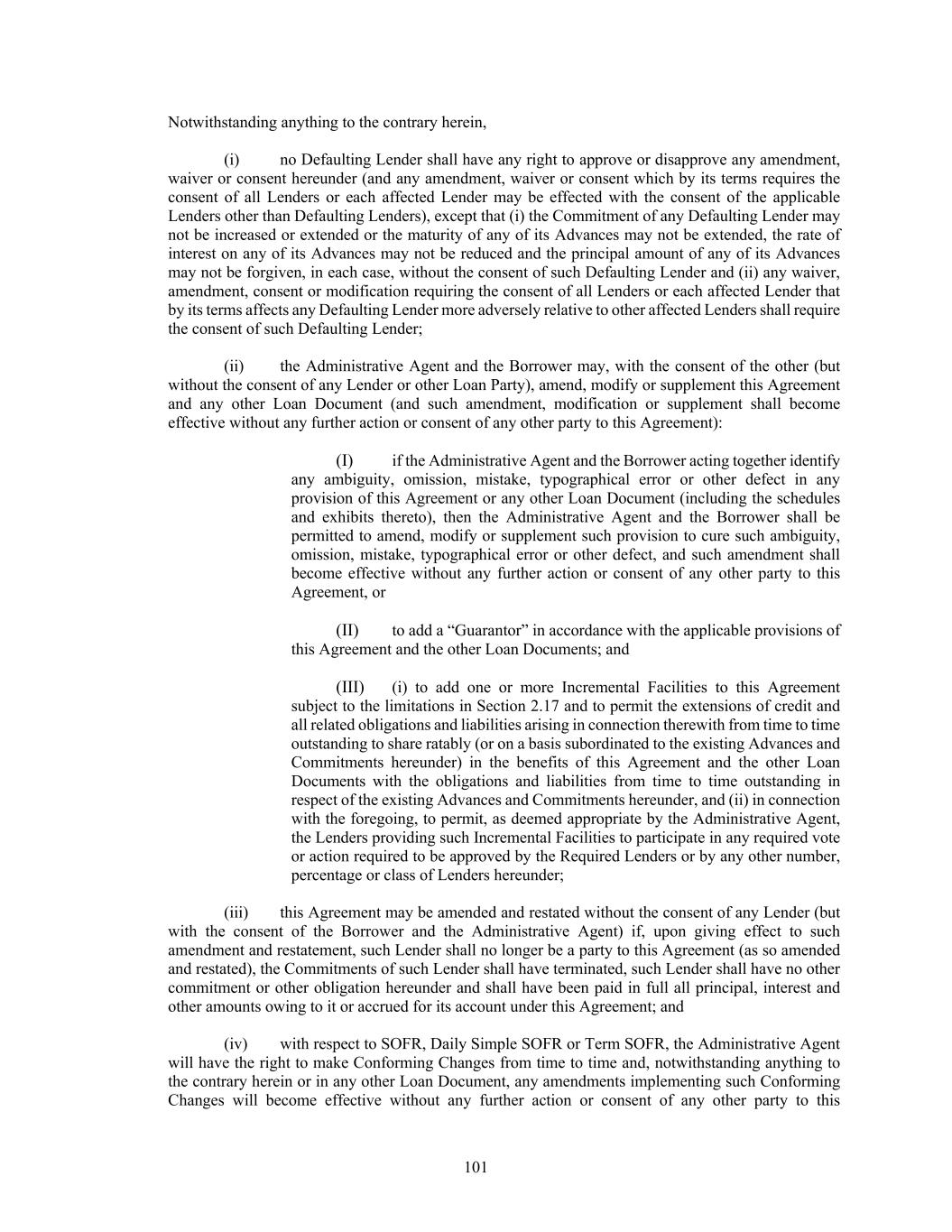 101 Notwithstanding anything to the contrary herein, (i) no Defaulting Lender shall have any right to approve or disapprove any amendment, waiver or consent hereunder (and any amendment, waiver or consent which by its terms requires the consent of all Lenders or each affected Lender may be effected with the consent of the applicable Lenders other than Defaulting Lenders), except that (i) the Commitment of any Defaulting Lender may not be increased or extended or the maturity of any of its Advances may not be extended, the rate of interest on any of its Advances may not be reduced and the principal amount of any of its Advances may not be forgiven, in each case, without the consent of such Defaulting Lender and (ii) any waiver, amendment, consent or modification requiring the consent of all Lenders or each affected Lender that by its terms affects any Defaulting Lender more adversely relative to other affected Lenders shall require the consent of such Defaulting Lender; (ii) the Administrative Agent and the Borrower may, with the consent of the other (but without the consent of any Lender or other Loan Party), amend, modify or supplement this Agreement and any other Loan Document (and such amendment, modification or supplement shall become effective without any further action or consent of any other party to this Agreement): (I) if the Administrative Agent and the Borrower acting together identify any ambiguity, omission, mistake, typographical error or other defect in any provision of this Agreement or any other Loan Document (including the schedules and exhibits thereto), then the Administrative Agent and the Borrower shall be permitted to amend, modify or supplement such provision to cure such ambiguity, omission, mistake, typographical error or other defect, and such amendment shall become effective without any further action or consent of any other party to this Agreement, or (II) to add a “Guarantor” in accordance with the applicable provisions of this Agreement and the other Loan Documents; and (III) (i) to add one or more Incremental Facilities to this Agreement subject to the limitations in Section 2.17 and to permit the extensions of credit and all related obligations and liabilities arising in connection therewith from time to time outstanding to share ratably (or on a basis subordinated to the existing Advances and Commitments hereunder) in the benefits of this Agreement and the other Loan Documents with the obligations and liabilities from time to time outstanding in respect of the existing Advances and Commitments hereunder, and (ii) in connection with the foregoing, to permit, as deemed appropriate by the Administrative Agent, the Lenders providing such Incremental Facilities to participate in any required vote or action required to be approved by the Required Lenders or by any other number, percentage or class of Lenders hereunder; (iii) this Agreement may be amended and restated without the consent of any Lender (but with the consent of the Borrower and the Administrative Agent) if, upon giving effect to such amendment and restatement, such Lender shall no longer be a party to this Agreement (as so amended and restated), the Commitments of such Lender shall have terminated, such Lender shall have no other commitment or other obligation hereunder and shall have been paid in full all principal, interest and other amounts owing to it or accrued for its account under this Agreement; and (iv) with respect to SOFR, Daily Simple SOFR or Term SOFR, the Administrative Agent will have the right to make Conforming Changes from time to time and, notwithstanding anything to the contrary herein or in any other Loan Document, any amendments implementing such Conforming Changes will become effective without any further action or consent of any other party to this