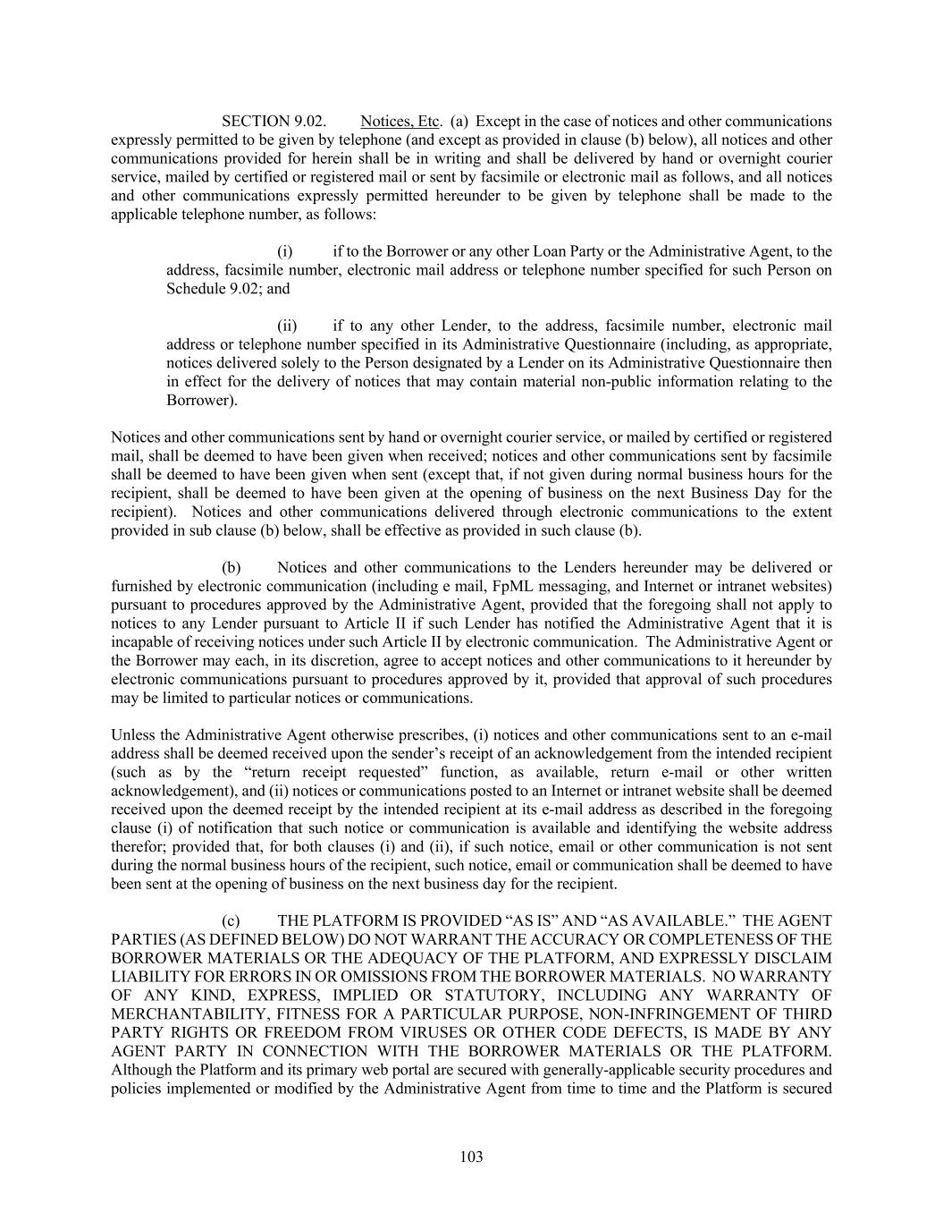 103 SECTION 9.02. Notices, Etc. (a) Except in the case of notices and other communications expressly permitted to be given by telephone (and except as provided in clause (b) below), all notices and other communications provided for herein shall be in writing and shall be delivered by hand or overnight courier service, mailed by certified or registered mail or sent by facsimile or electronic mail as follows, and all notices and other communications expressly permitted hereunder to be given by telephone shall be made to the applicable telephone number, as follows: (i) if to the Borrower or any other Loan Party or the Administrative Agent, to the address, facsimile number, electronic mail address or telephone number specified for such Person on Schedule 9.02; and (ii) if to any other Lender, to the address, facsimile number, electronic mail address or telephone number specified in its Administrative Questionnaire (including, as appropriate, notices delivered solely to the Person designated by a Lender on its Administrative Questionnaire then in effect for the delivery of notices that may contain material non-public information relating to the Borrower). Notices and other communications sent by hand or overnight courier service, or mailed by certified or registered mail, shall be deemed to have been given when received; notices and other communications sent by facsimile shall be deemed to have been given when sent (except that, if not given during normal business hours for the recipient, shall be deemed to have been given at the opening of business on the next Business Day for the recipient). Notices and other communications delivered through electronic communications to the extent provided in sub clause (b) below, shall be effective as provided in such clause (b). (b) Notices and other communications to the Lenders hereunder may be delivered or furnished by electronic communication (including e mail, FpML messaging, and Internet or intranet websites) pursuant to procedures approved by the Administrative Agent, provided that the foregoing shall not apply to notices to any Lender pursuant to Article II if such Lender has notified the Administrative Agent that it is incapable of receiving notices under such Article II by electronic communication. The Administrative Agent or the Borrower may each, in its discretion, agree to accept notices and other communications to it hereunder by electronic communications pursuant to procedures approved by it, provided that approval of such procedures may be limited to particular notices or communications. Unless the Administrative Agent otherwise prescribes, (i) notices and other communications sent to an e-mail address shall be deemed received upon the sender’s receipt of an acknowledgement from the intended recipient (such as by the “return receipt requested” function, as available, return e-mail or other written acknowledgement), and (ii) notices or communications posted to an Internet or intranet website shall be deemed received upon the deemed receipt by the intended recipient at its e-mail address as described in the foregoing clause (i) of notification that such notice or communication is available and identifying the website address therefor; provided that, for both clauses (i) and (ii), if such notice, email or other communication is not sent during the normal business hours of the recipient, such notice, email or communication shall be deemed to have been sent at the opening of business on the next business day for the recipient. (c) THE PLATFORM IS PROVIDED “AS IS” AND “AS AVAILABLE.” THE AGENT PARTIES (AS DEFINED BELOW) DO NOT WARRANT THE ACCURACY OR COMPLETENESS OF THE BORROWER MATERIALS OR THE ADEQUACY OF THE PLATFORM, AND EXPRESSLY DISCLAIM LIABILITY FOR ERRORS IN OR OMISSIONS FROM THE BORROWER MATERIALS. NO WARRANTY OF ANY KIND, EXPRESS, IMPLIED OR STATUTORY, INCLUDING ANY WARRANTY OF MERCHANTABILITY, FITNESS FOR A PARTICULAR PURPOSE, NON-INFRINGEMENT OF THIRD PARTY RIGHTS OR FREEDOM FROM VIRUSES OR OTHER CODE DEFECTS, IS MADE BY ANY AGENT PARTY IN CONNECTION WITH THE BORROWER MATERIALS OR THE PLATFORM. Although the Platform and its primary web portal are secured with generally-applicable security procedures and policies implemented or modified by the Administrative Agent from time to time and the Platform is secured