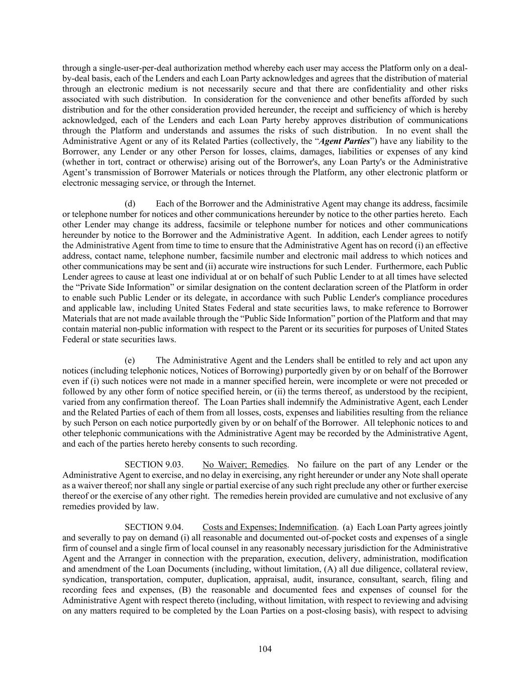 104 through a single-user-per-deal authorization method whereby each user may access the Platform only on a deal- by-deal basis, each of the Lenders and each Loan Party acknowledges and agrees that the distribution of material through an electronic medium is not necessarily secure and that there are confidentiality and other risks associated with such distribution. In consideration for the convenience and other benefits afforded by such distribution and for the other consideration provided hereunder, the receipt and sufficiency of which is hereby acknowledged, each of the Lenders and each Loan Party hereby approves distribution of communications through the Platform and understands and assumes the risks of such distribution. In no event shall the Administrative Agent or any of its Related Parties (collectively, the “Agent Parties”) have any liability to the Borrower, any Lender or any other Person for losses, claims, damages, liabilities or expenses of any kind (whether in tort, contract or otherwise) arising out of the Borrower's, any Loan Party's or the Administrative Agent’s transmission of Borrower Materials or notices through the Platform, any other electronic platform or electronic messaging service, or through the Internet. (d) Each of the Borrower and the Administrative Agent may change its address, facsimile or telephone number for notices and other communications hereunder by notice to the other parties hereto. Each other Lender may change its address, facsimile or telephone number for notices and other communications hereunder by notice to the Borrower and the Administrative Agent. In addition, each Lender agrees to notify the Administrative Agent from time to time to ensure that the Administrative Agent has on record (i) an effective address, contact name, telephone number, facsimile number and electronic mail address to which notices and other communications may be sent and (ii) accurate wire instructions for such Lender. Furthermore, each Public Lender agrees to cause at least one individual at or on behalf of such Public Lender to at all times have selected the “Private Side Information” or similar designation on the content declaration screen of the Platform in order to enable such Public Lender or its delegate, in accordance with such Public Lender's compliance procedures and applicable law, including United States Federal and state securities laws, to make reference to Borrower Materials that are not made available through the “Public Side Information” portion of the Platform and that may contain material non-public information with respect to the Parent or its securities for purposes of United States Federal or state securities laws. (e) The Administrative Agent and the Lenders shall be entitled to rely and act upon any notices (including telephonic notices, Notices of Borrowing) purportedly given by or on behalf of the Borrower even if (i) such notices were not made in a manner specified herein, were incomplete or were not preceded or followed by any other form of notice specified herein, or (ii) the terms thereof, as understood by the recipient, varied from any confirmation thereof. The Loan Parties shall indemnify the Administrative Agent, each Lender and the Related Parties of each of them from all losses, costs, expenses and liabilities resulting from the reliance by such Person on each notice purportedly given by or on behalf of the Borrower. All telephonic notices to and other telephonic communications with the Administrative Agent may be recorded by the Administrative Agent, and each of the parties hereto hereby consents to such recording. SECTION 9.03. No Waiver; Remedies. No failure on the part of any Lender or the Administrative Agent to exercise, and no delay in exercising, any right hereunder or under any Note shall operate as a waiver thereof; nor shall any single or partial exercise of any such right preclude any other or further exercise thereof or the exercise of any other right. The remedies herein provided are cumulative and not exclusive of any remedies provided by law. SECTION 9.04. Costs and Expenses; Indemnification. (a) Each Loan Party agrees jointly and severally to pay on demand (i) all reasonable and documented out-of-pocket costs and expenses of a single firm of counsel and a single firm of local counsel in any reasonably necessary jurisdiction for the Administrative Agent and the Arranger in connection with the preparation, execution, delivery, administration, modification and amendment of the Loan Documents (including, without limitation, (A) all due diligence, collateral review, syndication, transportation, computer, duplication, appraisal, audit, insurance, consultant, search, filing and recording fees and expenses, (B) the reasonable and documented fees and expenses of counsel for the Administrative Agent with respect thereto (including, without limitation, with respect to reviewing and advising on any matters required to be completed by the Loan Parties on a post-closing basis), with respect to advising