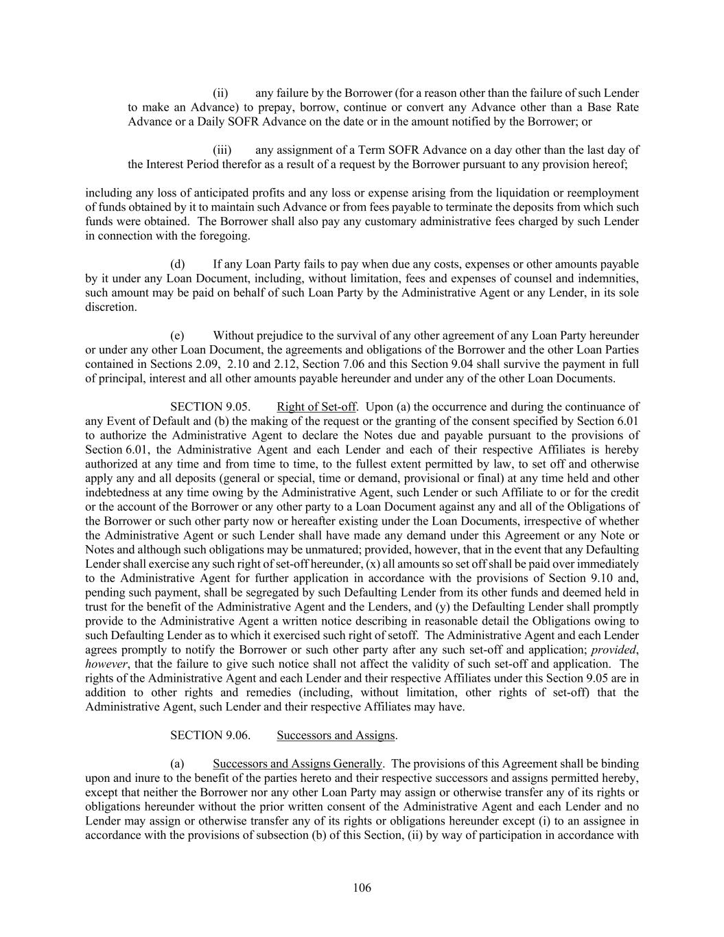 106 (ii) any failure by the Borrower (for a reason other than the failure of such Lender to make an Advance) to prepay, borrow, continue or convert any Advance other than a Base Rate Advance or a Daily SOFR Advance on the date or in the amount notified by the Borrower; or (iii) any assignment of a Term SOFR Advance on a day other than the last day of the Interest Period therefor as a result of a request by the Borrower pursuant to any provision hereof; including any loss of anticipated profits and any loss or expense arising from the liquidation or reemployment of funds obtained by it to maintain such Advance or from fees payable to terminate the deposits from which such funds were obtained. The Borrower shall also pay any customary administrative fees charged by such Lender in connection with the foregoing. (d) If any Loan Party fails to pay when due any costs, expenses or other amounts payable by it under any Loan Document, including, without limitation, fees and expenses of counsel and indemnities, such amount may be paid on behalf of such Loan Party by the Administrative Agent or any Lender, in its sole discretion. (e) Without prejudice to the survival of any other agreement of any Loan Party hereunder or under any other Loan Document, the agreements and obligations of the Borrower and the other Loan Parties contained in Sections 2.09, 2.10 and 2.12, Section 7.06 and this Section 9.04 shall survive the payment in full of principal, interest and all other amounts payable hereunder and under any of the other Loan Documents. SECTION 9.05. Right of Set-off. Upon (a) the occurrence and during the continuance of any Event of Default and (b) the making of the request or the granting of the consent specified by Section 6.01 to authorize the Administrative Agent to declare the Notes due and payable pursuant to the provisions of Section 6.01, the Administrative Agent and each Lender and each of their respective Affiliates is hereby authorized at any time and from time to time, to the fullest extent permitted by law, to set off and otherwise apply any and all deposits (general or special, time or demand, provisional or final) at any time held and other indebtedness at any time owing by the Administrative Agent, such Lender or such Affiliate to or for the credit or the account of the Borrower or any other party to a Loan Document against any and all of the Obligations of the Borrower or such other party now or hereafter existing under the Loan Documents, irrespective of whether the Administrative Agent or such Lender shall have made any demand under this Agreement or any Note or Notes and although such obligations may be unmatured; provided, however, that in the event that any Defaulting Lender shall exercise any such right of set-off hereunder, (x) all amounts so set off shall be paid over immediately to the Administrative Agent for further application in accordance with the provisions of Section 9.10 and, pending such payment, shall be segregated by such Defaulting Lender from its other funds and deemed held in trust for the benefit of the Administrative Agent and the Lenders, and (y) the Defaulting Lender shall promptly provide to the Administrative Agent a written notice describing in reasonable detail the Obligations owing to such Defaulting Lender as to which it exercised such right of setoff. The Administrative Agent and each Lender agrees promptly to notify the Borrower or such other party after any such set-off and application; provided, however, that the failure to give such notice shall not affect the validity of such set-off and application. The rights of the Administrative Agent and each Lender and their respective Affiliates under this Section 9.05 are in addition to other rights and remedies (including, without limitation, other rights of set-off) that the Administrative Agent, such Lender and their respective Affiliates may have. SECTION 9.06. Successors and Assigns. (a) Successors and Assigns Generally. The provisions of this Agreement shall be binding upon and inure to the benefit of the parties hereto and their respective successors and assigns permitted hereby, except that neither the Borrower nor any other Loan Party may assign or otherwise transfer any of its rights or obligations hereunder without the prior written consent of the Administrative Agent and each Lender and no Lender may assign or otherwise transfer any of its rights or obligations hereunder except (i) to an assignee in accordance with the provisions of subsection (b) of this Section, (ii) by way of participation in accordance with