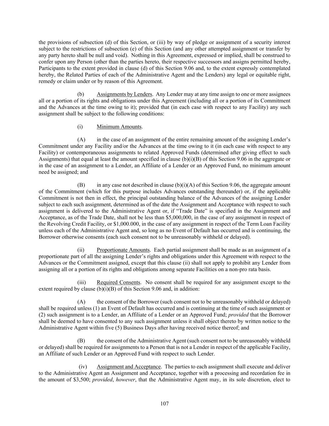107 the provisions of subsection (d) of this Section, or (iii) by way of pledge or assignment of a security interest subject to the restrictions of subsection (e) of this Section (and any other attempted assignment or transfer by any party hereto shall be null and void). Nothing in this Agreement, expressed or implied, shall be construed to confer upon any Person (other than the parties hereto, their respective successors and assigns permitted hereby, Participants to the extent provided in clause (d) of this Section 9.06 and, to the extent expressly contemplated hereby, the Related Parties of each of the Administrative Agent and the Lenders) any legal or equitable right, remedy or claim under or by reason of this Agreement. (b) Assignments by Lenders. Any Lender may at any time assign to one or more assignees all or a portion of its rights and obligations under this Agreement (including all or a portion of its Commitment and the Advances at the time owing to it); provided that (in each case with respect to any Facility) any such assignment shall be subject to the following conditions: (i) Minimum Amounts. (A) in the case of an assignment of the entire remaining amount of the assigning Lender’s Commitment under any Facility and/or the Advances at the time owing to it (in each case with respect to any Facility) or contemporaneous assignments to related Approved Funds (determined after giving effect to such Assignments) that equal at least the amount specified in clause (b)(i)(B) of this Section 9.06 in the aggregate or in the case of an assignment to a Lender, an Affiliate of a Lender or an Approved Fund, no minimum amount need be assigned; and (B) in any case not described in clause (b)(i)(A) of this Section 9.06, the aggregate amount of the Commitment (which for this purpose includes Advances outstanding thereunder) or, if the applicable Commitment is not then in effect, the principal outstanding balance of the Advances of the assigning Lender subject to each such assignment, determined as of the date the Assignment and Acceptance with respect to such assignment is delivered to the Administrative Agent or, if “Trade Date” is specified in the Assignment and Acceptance, as of the Trade Date, shall not be less than $5,000,000, in the case of any assignment in respect of the Revolving Credit Facility, or $1,000.000, in the case of any assignment in respect of the Term Loan Facility unless each of the Administrative Agent and, so long as no Event of Default has occurred and is continuing, the Borrower otherwise consents (each such consent not to be unreasonably withheld or delayed). (ii) Proportionate Amounts. Each partial assignment shall be made as an assignment of a proportionate part of all the assigning Lender’s rights and obligations under this Agreement with respect to the Advances or the Commitment assigned, except that this clause (ii) shall not apply to prohibit any Lender from assigning all or a portion of its rights and obligations among separate Facilities on a non-pro rata basis. (iii) Required Consents. No consent shall be required for any assignment except to the extent required by clause (b)(i)(B) of this Section 9.06 and, in addition: (A) the consent of the Borrower (such consent not to be unreasonably withheld or delayed) shall be required unless (1) an Event of Default has occurred and is continuing at the time of such assignment or (2) such assignment is to a Lender, an Affiliate of a Lender or an Approved Fund; provided that the Borrower shall be deemed to have consented to any such assignment unless it shall object thereto by written notice to the Administrative Agent within five (5) Business Days after having received notice thereof; and (B) the consent of the Administrative Agent (such consent not to be unreasonably withheld or delayed) shall be required for assignments to a Person that is not a Lender in respect of the applicable Facility, an Affiliate of such Lender or an Approved Fund with respect to such Lender. (iv) Assignment and Acceptance. The parties to each assignment shall execute and deliver to the Administrative Agent an Assignment and Acceptance, together with a processing and recordation fee in the amount of $3,500; provided, however, that the Administrative Agent may, in its sole discretion, elect to