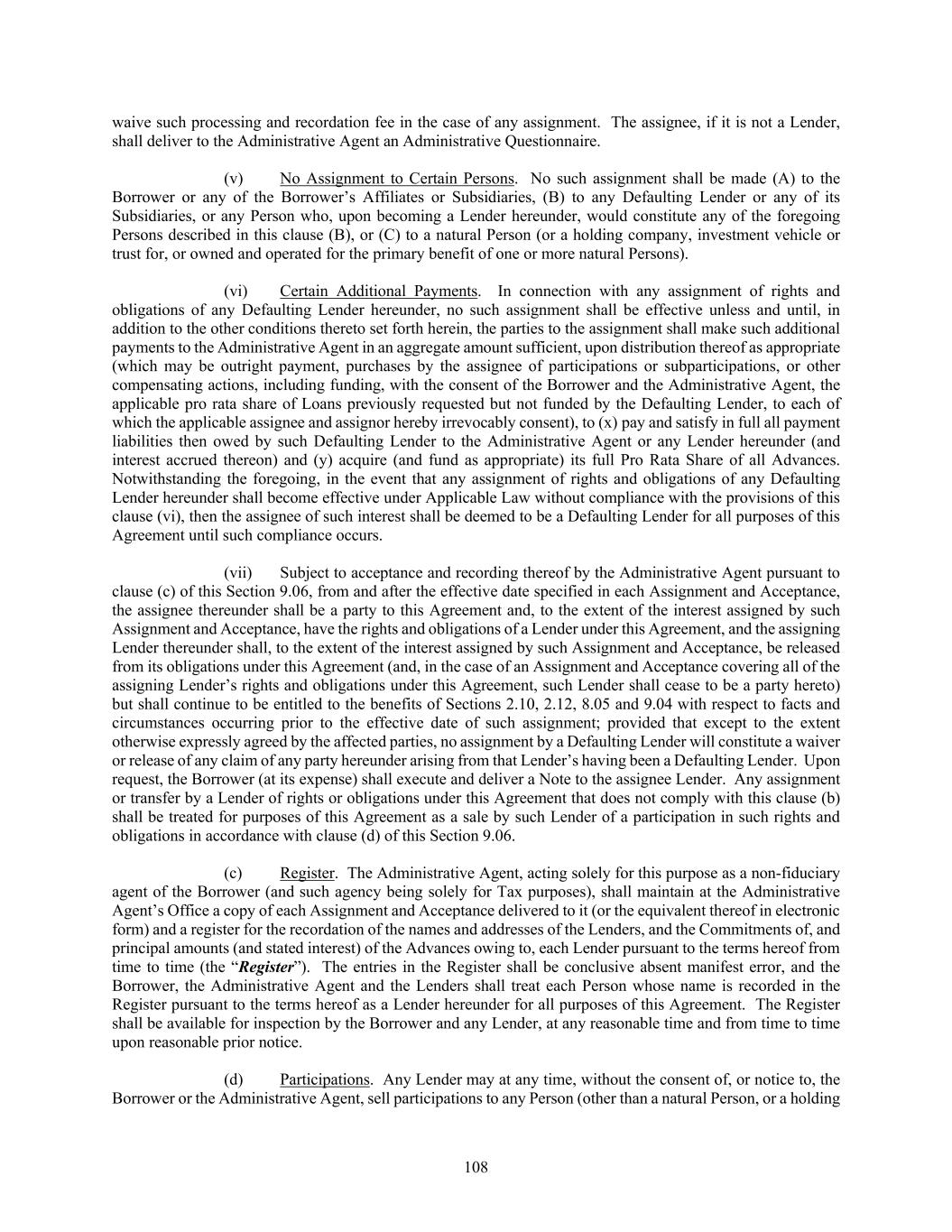 108 waive such processing and recordation fee in the case of any assignment. The assignee, if it is not a Lender, shall deliver to the Administrative Agent an Administrative Questionnaire. (v) No Assignment to Certain Persons. No such assignment shall be made (A) to the Borrower or any of the Borrower’s Affiliates or Subsidiaries, (B) to any Defaulting Lender or any of its Subsidiaries, or any Person who, upon becoming a Lender hereunder, would constitute any of the foregoing Persons described in this clause (B), or (C) to a natural Person (or a holding company, investment vehicle or trust for, or owned and operated for the primary benefit of one or more natural Persons). (vi) Certain Additional Payments. In connection with any assignment of rights and obligations of any Defaulting Lender hereunder, no such assignment shall be effective unless and until, in addition to the other conditions thereto set forth herein, the parties to the assignment shall make such additional payments to the Administrative Agent in an aggregate amount sufficient, upon distribution thereof as appropriate (which may be outright payment, purchases by the assignee of participations or subparticipations, or other compensating actions, including funding, with the consent of the Borrower and the Administrative Agent, the applicable pro rata share of Loans previously requested but not funded by the Defaulting Lender, to each of which the applicable assignee and assignor hereby irrevocably consent), to (x) pay and satisfy in full all payment liabilities then owed by such Defaulting Lender to the Administrative Agent or any Lender hereunder (and interest accrued thereon) and (y) acquire (and fund as appropriate) its full Pro Rata Share of all Advances. Notwithstanding the foregoing, in the event that any assignment of rights and obligations of any Defaulting Lender hereunder shall become effective under Applicable Law without compliance with the provisions of this clause (vi), then the assignee of such interest shall be deemed to be a Defaulting Lender for all purposes of this Agreement until such compliance occurs. (vii) Subject to acceptance and recording thereof by the Administrative Agent pursuant to clause (c) of this Section 9.06, from and after the effective date specified in each Assignment and Acceptance, the assignee thereunder shall be a party to this Agreement and, to the extent of the interest assigned by such Assignment and Acceptance, have the rights and obligations of a Lender under this Agreement, and the assigning Lender thereunder shall, to the extent of the interest assigned by such Assignment and Acceptance, be released from its obligations under this Agreement (and, in the case of an Assignment and Acceptance covering all of the assigning Lender’s rights and obligations under this Agreement, such Lender shall cease to be a party hereto) but shall continue to be entitled to the benefits of Sections 2.10, 2.12, 8.05 and 9.04 with respect to facts and circumstances occurring prior to the effective date of such assignment; provided that except to the extent otherwise expressly agreed by the affected parties, no assignment by a Defaulting Lender will constitute a waiver or release of any claim of any party hereunder arising from that Lender’s having been a Defaulting Lender. Upon request, the Borrower (at its expense) shall execute and deliver a Note to the assignee Lender. Any assignment or transfer by a Lender of rights or obligations under this Agreement that does not comply with this clause (b) shall be treated for purposes of this Agreement as a sale by such Lender of a participation in such rights and obligations in accordance with clause (d) of this Section 9.06. (c) Register. The Administrative Agent, acting solely for this purpose as a non-fiduciary agent of the Borrower (and such agency being solely for Tax purposes), shall maintain at the Administrative Agent’s Office a copy of each Assignment and Acceptance delivered to it (or the equivalent thereof in electronic form) and a register for the recordation of the names and addresses of the Lenders, and the Commitments of, and principal amounts (and stated interest) of the Advances owing to, each Lender pursuant to the terms hereof from time to time (the “Register”). The entries in the Register shall be conclusive absent manifest error, and the Borrower, the Administrative Agent and the Lenders shall treat each Person whose name is recorded in the Register pursuant to the terms hereof as a Lender hereunder for all purposes of this Agreement. The Register shall be available for inspection by the Borrower and any Lender, at any reasonable time and from time to time upon reasonable prior notice. (d) Participations. Any Lender may at any time, without the consent of, or notice to, the Borrower or the Administrative Agent, sell participations to any Person (other than a natural Person, or a holding