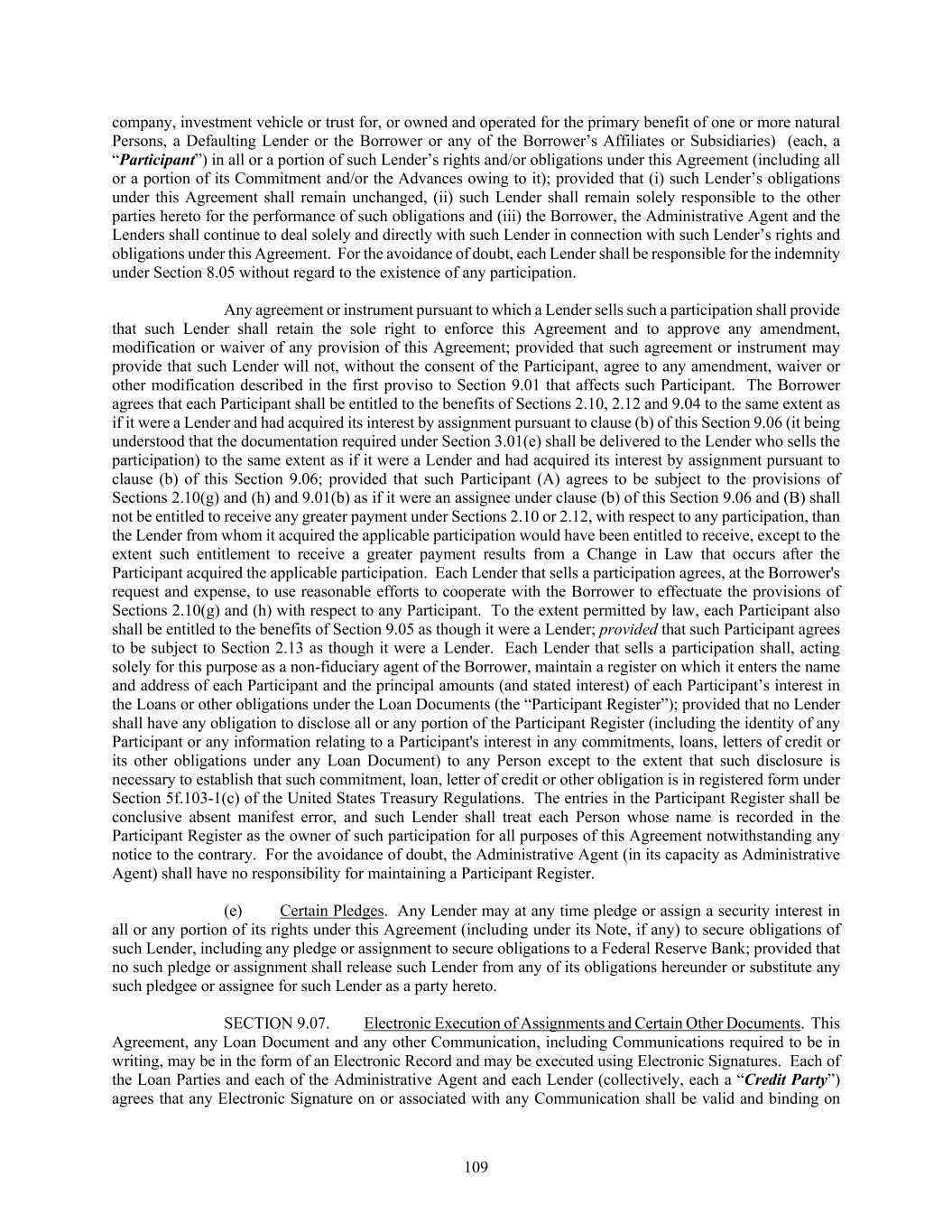 109 company, investment vehicle or trust for, or owned and operated for the primary benefit of one or more natural Persons, a Defaulting Lender or the Borrower or any of the Borrower’s Affiliates or Subsidiaries) (each, a “Participant”) in all or a portion of such Lender’s rights and/or obligations under this Agreement (including all or a portion of its Commitment and/or the Advances owing to it); provided that (i) such Lender’s obligations under this Agreement shall remain unchanged, (ii) such Lender shall remain solely responsible to the other parties hereto for the performance of such obligations and (iii) the Borrower, the Administrative Agent and the Lenders shall continue to deal solely and directly with such Lender in connection with such Lender’s rights and obligations under this Agreement. For the avoidance of doubt, each Lender shall be responsible for the indemnity under Section 8.05 without regard to the existence of any participation. Any agreement or instrument pursuant to which a Lender sells such a participation shall provide that such Lender shall retain the sole right to enforce this Agreement and to approve any amendment, modification or waiver of any provision of this Agreement; provided that such agreement or instrument may provide that such Lender will not, without the consent of the Participant, agree to any amendment, waiver or other modification described in the first proviso to Section 9.01 that affects such Participant. The Borrower agrees that each Participant shall be entitled to the benefits of Sections 2.10, 2.12 and 9.04 to the same extent as if it were a Lender and had acquired its interest by assignment pursuant to clause (b) of this Section 9.06 (it being understood that the documentation required under Section 3.01(e) shall be delivered to the Lender who sells the participation) to the same extent as if it were a Lender and had acquired its interest by assignment pursuant to clause (b) of this Section 9.06; provided that such Participant (A) agrees to be subject to the provisions of Sections 2.10(g) and (h) and 9.01(b) as if it were an assignee under clause (b) of this Section 9.06 and (B) shall not be entitled to receive any greater payment under Sections 2.10 or 2.12, with respect to any participation, than the Lender from whom it acquired the applicable participation would have been entitled to receive, except to the extent such entitlement to receive a greater payment results from a Change in Law that occurs after the Participant acquired the applicable participation. Each Lender that sells a participation agrees, at the Borrower's request and expense, to use reasonable efforts to cooperate with the Borrower to effectuate the provisions of Sections 2.10(g) and (h) with respect to any Participant. To the extent permitted by law, each Participant also shall be entitled to the benefits of Section 9.05 as though it were a Lender; provided that such Participant agrees to be subject to Section 2.13 as though it were a Lender. Each Lender that sells a participation shall, acting solely for this purpose as a non-fiduciary agent of the Borrower, maintain a register on which it enters the name and address of each Participant and the principal amounts (and stated interest) of each Participant’s interest in the Loans or other obligations under the Loan Documents (the “Participant Register”); provided that no Lender shall have any obligation to disclose all or any portion of the Participant Register (including the identity of any Participant or any information relating to a Participant's interest in any commitments, loans, letters of credit or its other obligations under any Loan Document) to any Person except to the extent that such disclosure is necessary to establish that such commitment, loan, letter of credit or other obligation is in registered form under Section 5f.103-1(c) of the United States Treasury Regulations. The entries in the Participant Register shall be conclusive absent manifest error, and such Lender shall treat each Person whose name is recorded in the Participant Register as the owner of such participation for all purposes of this Agreement notwithstanding any notice to the contrary. For the avoidance of doubt, the Administrative Agent (in its capacity as Administrative Agent) shall have no responsibility for maintaining a Participant Register. (e) Certain Pledges. Any Lender may at any time pledge or assign a security interest in all or any portion of its rights under this Agreement (including under its Note, if any) to secure obligations of such Lender, including any pledge or assignment to secure obligations to a Federal Reserve Bank; provided that no such pledge or assignment shall release such Lender from any of its obligations hereunder or substitute any such pledgee or assignee for such Lender as a party hereto. SECTION 9.07. Electronic Execution of Assignments and Certain Other Documents. This Agreement, any Loan Document and any other Communication, including Communications required to be in writing, may be in the form of an Electronic Record and may be executed using Electronic Signatures. Each of the Loan Parties and each of the Administrative Agent and each Lender (collectively, each a “Credit Party”) agrees that any Electronic Signature on or associated with any Communication shall be valid and binding on