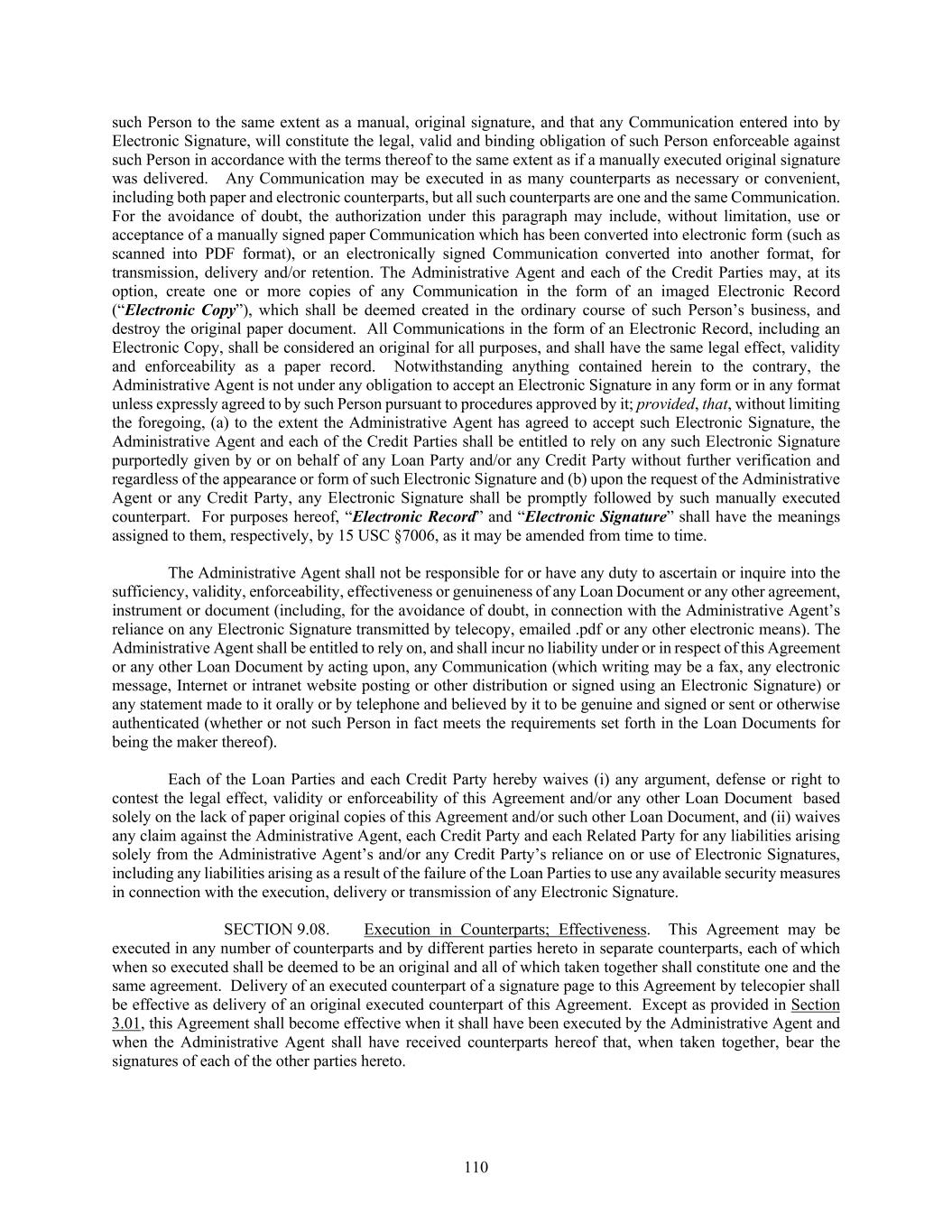 110 such Person to the same extent as a manual, original signature, and that any Communication entered into by Electronic Signature, will constitute the legal, valid and binding obligation of such Person enforceable against such Person in accordance with the terms thereof to the same extent as if a manually executed original signature was delivered. Any Communication may be executed in as many counterparts as necessary or convenient, including both paper and electronic counterparts, but all such counterparts are one and the same Communication. For the avoidance of doubt, the authorization under this paragraph may include, without limitation, use or acceptance of a manually signed paper Communication which has been converted into electronic form (such as scanned into PDF format), or an electronically signed Communication converted into another format, for transmission, delivery and/or retention. The Administrative Agent and each of the Credit Parties may, at its option, create one or more copies of any Communication in the form of an imaged Electronic Record (“Electronic Copy”), which shall be deemed created in the ordinary course of such Person’s business, and destroy the original paper document. All Communications in the form of an Electronic Record, including an Electronic Copy, shall be considered an original for all purposes, and shall have the same legal effect, validity and enforceability as a paper record. Notwithstanding anything contained herein to the contrary, the Administrative Agent is not under any obligation to accept an Electronic Signature in any form or in any format unless expressly agreed to by such Person pursuant to procedures approved by it; provided, that, without limiting the foregoing, (a) to the extent the Administrative Agent has agreed to accept such Electronic Signature, the Administrative Agent and each of the Credit Parties shall be entitled to rely on any such Electronic Signature purportedly given by or on behalf of any Loan Party and/or any Credit Party without further verification and regardless of the appearance or form of such Electronic Signature and (b) upon the request of the Administrative Agent or any Credit Party, any Electronic Signature shall be promptly followed by such manually executed counterpart. For purposes hereof, “Electronic Record” and “Electronic Signature” shall have the meanings assigned to them, respectively, by 15 USC §7006, as it may be amended from time to time. The Administrative Agent shall not be responsible for or have any duty to ascertain or inquire into the sufficiency, validity, enforceability, effectiveness or genuineness of any Loan Document or any other agreement, instrument or document (including, for the avoidance of doubt, in connection with the Administrative Agent’s reliance on any Electronic Signature transmitted by telecopy, emailed .pdf or any other electronic means). The Administrative Agent shall be entitled to rely on, and shall incur no liability under or in respect of this Agreement or any other Loan Document by acting upon, any Communication (which writing may be a fax, any electronic message, Internet or intranet website posting or other distribution or signed using an Electronic Signature) or any statement made to it orally or by telephone and believed by it to be genuine and signed or sent or otherwise authenticated (whether or not such Person in fact meets the requirements set forth in the Loan Documents for being the maker thereof). Each of the Loan Parties and each Credit Party hereby waives (i) any argument, defense or right to contest the legal effect, validity or enforceability of this Agreement and/or any other Loan Document based solely on the lack of paper original copies of this Agreement and/or such other Loan Document, and (ii) waives any claim against the Administrative Agent, each Credit Party and each Related Party for any liabilities arising solely from the Administrative Agent’s and/or any Credit Party’s reliance on or use of Electronic Signatures, including any liabilities arising as a result of the failure of the Loan Parties to use any available security measures in connection with the execution, delivery or transmission of any Electronic Signature. SECTION 9.08. Execution in Counterparts; Effectiveness. This Agreement may be executed in any number of counterparts and by different parties hereto in separate counterparts, each of which when so executed shall be deemed to be an original and all of which taken together shall constitute one and the same agreement. Delivery of an executed counterpart of a signature page to this Agreement by telecopier shall be effective as delivery of an original executed counterpart of this Agreement. Except as provided in Section 3.01, this Agreement shall become effective when it shall have been executed by the Administrative Agent and when the Administrative Agent shall have received counterparts hereof that, when taken together, bear the signatures of each of the other parties hereto.