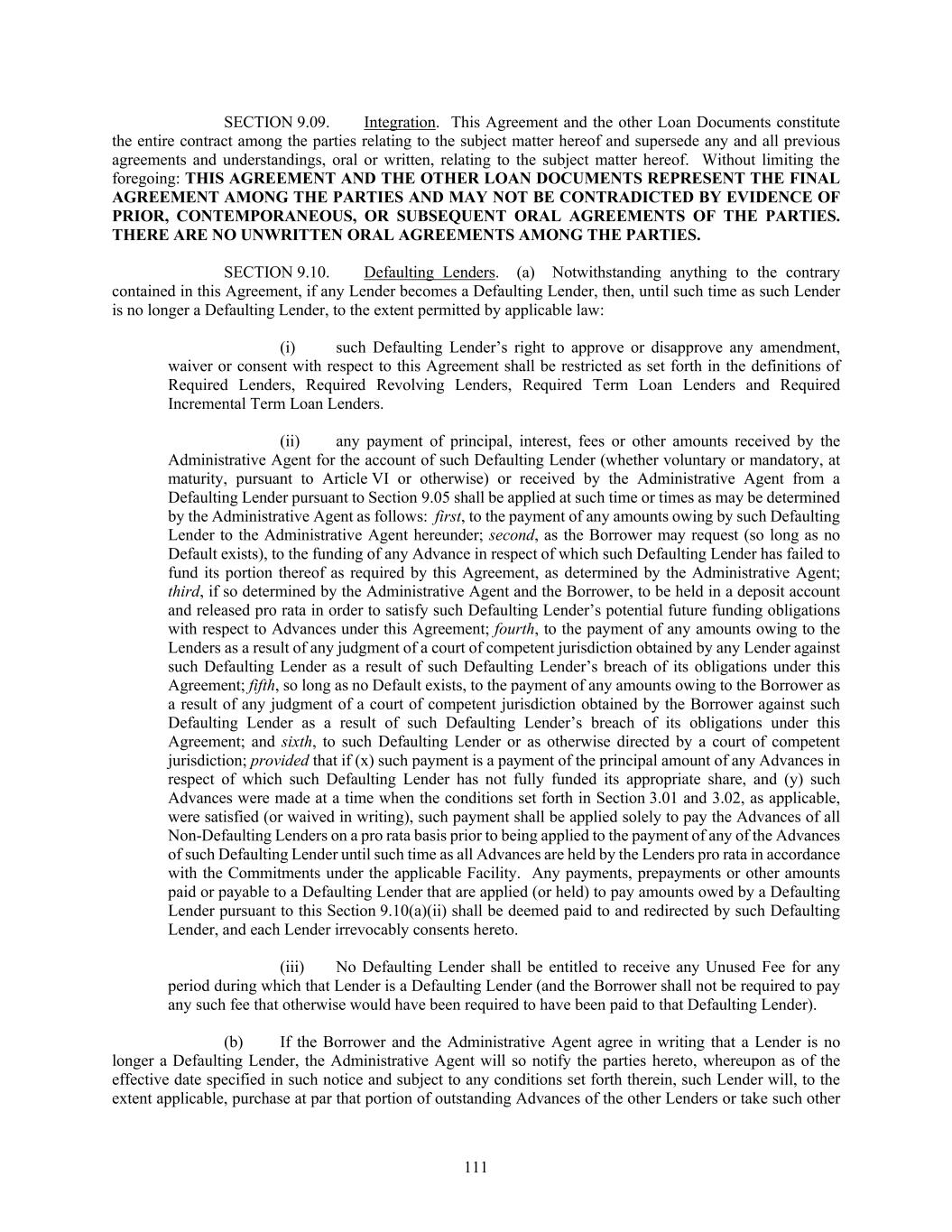 111 SECTION 9.09. Integration. This Agreement and the other Loan Documents constitute the entire contract among the parties relating to the subject matter hereof and supersede any and all previous agreements and understandings, oral or written, relating to the subject matter hereof. Without limiting the foregoing: THIS AGREEMENT AND THE OTHER LOAN DOCUMENTS REPRESENT THE FINAL AGREEMENT AMONG THE PARTIES AND MAY NOT BE CONTRADICTED BY EVIDENCE OF PRIOR, CONTEMPORANEOUS, OR SUBSEQUENT ORAL AGREEMENTS OF THE PARTIES. THERE ARE NO UNWRITTEN ORAL AGREEMENTS AMONG THE PARTIES. SECTION 9.10. Defaulting Lenders. (a) Notwithstanding anything to the contrary contained in this Agreement, if any Lender becomes a Defaulting Lender, then, until such time as such Lender is no longer a Defaulting Lender, to the extent permitted by applicable law: (i) such Defaulting Lender’s right to approve or disapprove any amendment, waiver or consent with respect to this Agreement shall be restricted as set forth in the definitions of Required Lenders, Required Revolving Lenders, Required Term Loan Lenders and Required Incremental Term Loan Lenders. (ii) any payment of principal, interest, fees or other amounts received by the Administrative Agent for the account of such Defaulting Lender (whether voluntary or mandatory, at maturity, pursuant to Article VI or otherwise) or received by the Administrative Agent from a Defaulting Lender pursuant to Section 9.05 shall be applied at such time or times as may be determined by the Administrative Agent as follows: first, to the payment of any amounts owing by such Defaulting Lender to the Administrative Agent hereunder; second, as the Borrower may request (so long as no Default exists), to the funding of any Advance in respect of which such Defaulting Lender has failed to fund its portion thereof as required by this Agreement, as determined by the Administrative Agent; third, if so determined by the Administrative Agent and the Borrower, to be held in a deposit account and released pro rata in order to satisfy such Defaulting Lender’s potential future funding obligations with respect to Advances under this Agreement; fourth, to the payment of any amounts owing to the Lenders as a result of any judgment of a court of competent jurisdiction obtained by any Lender against such Defaulting Lender as a result of such Defaulting Lender’s breach of its obligations under this Agreement; fifth, so long as no Default exists, to the payment of any amounts owing to the Borrower as a result of any judgment of a court of competent jurisdiction obtained by the Borrower against such Defaulting Lender as a result of such Defaulting Lender’s breach of its obligations under this Agreement; and sixth, to such Defaulting Lender or as otherwise directed by a court of competent jurisdiction; provided that if (x) such payment is a payment of the principal amount of any Advances in respect of which such Defaulting Lender has not fully funded its appropriate share, and (y) such Advances were made at a time when the conditions set forth in Section 3.01 and 3.02, as applicable, were satisfied (or waived in writing), such payment shall be applied solely to pay the Advances of all Non-Defaulting Lenders on a pro rata basis prior to being applied to the payment of any of the Advances of such Defaulting Lender until such time as all Advances are held by the Lenders pro rata in accordance with the Commitments under the applicable Facility. Any payments, prepayments or other amounts paid or payable to a Defaulting Lender that are applied (or held) to pay amounts owed by a Defaulting Lender pursuant to this Section 9.10(a)(ii) shall be deemed paid to and redirected by such Defaulting Lender, and each Lender irrevocably consents hereto. (iii) No Defaulting Lender shall be entitled to receive any Unused Fee for any period during which that Lender is a Defaulting Lender (and the Borrower shall not be required to pay any such fee that otherwise would have been required to have been paid to that Defaulting Lender). (b) If the Borrower and the Administrative Agent agree in writing that a Lender is no longer a Defaulting Lender, the Administrative Agent will so notify the parties hereto, whereupon as of the effective date specified in such notice and subject to any conditions set forth therein, such Lender will, to the extent applicable, purchase at par that portion of outstanding Advances of the other Lenders or take such other