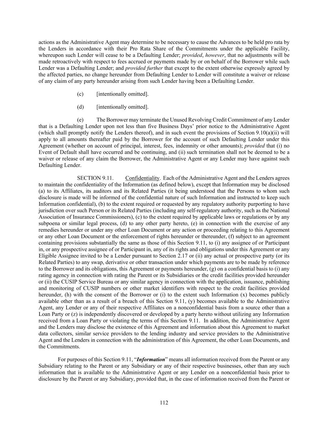 112 actions as the Administrative Agent may determine to be necessary to cause the Advances to be held pro rata by the Lenders in accordance with their Pro Rata Share of the Commitments under the applicable Facility, whereupon such Lender will cease to be a Defaulting Lender; provided, however, that no adjustments will be made retroactively with respect to fees accrued or payments made by or on behalf of the Borrower while such Lender was a Defaulting Lender; and provided further that except to the extent otherwise expressly agreed by the affected parties, no change hereunder from Defaulting Lender to Lender will constitute a waiver or release of any claim of any party hereunder arising from such Lender having been a Defaulting Lender. (c) [intentionally omitted]. (d) [intentionally omitted]. (e) The Borrower may terminate the Unused Revolving Credit Commitment of any Lender that is a Defaulting Lender upon not less than five Business Days’ prior notice to the Administrative Agent (which shall promptly notify the Lenders thereof), and in such event the provisions of Section 9.10(a)(ii) will apply to all amounts thereafter paid by the Borrower for the account of such Defaulting Lender under this Agreement (whether on account of principal, interest, fees, indemnity or other amounts); provided that (i) no Event of Default shall have occurred and be continuing, and (ii) such termination shall not be deemed to be a waiver or release of any claim the Borrower, the Administrative Agent or any Lender may have against such Defaulting Lender. SECTION 9.11. Confidentiality. Each of the Administrative Agent and the Lenders agrees to maintain the confidentiality of the Information (as defined below), except that Information may be disclosed (a) to its Affiliates, its auditors and its Related Parties (it being understood that the Persons to whom such disclosure is made will be informed of the confidential nature of such Information and instructed to keep such Information confidential), (b) to the extent required or requested by any regulatory authority purporting to have jurisdiction over such Person or its Related Parties (including any self-regulatory authority, such as the National Association of Insurance Commissioners), (c) to the extent required by applicable laws or regulations or by any subpoena or similar legal process, (d) to any other party hereto, (e) in connection with the exercise of any remedies hereunder or under any other Loan Document or any action or proceeding relating to this Agreement or any other Loan Document or the enforcement of rights hereunder or thereunder, (f) subject to an agreement containing provisions substantially the same as those of this Section 9.11, to (i) any assignee of or Participant in, or any prospective assignee of or Participant in, any of its rights and obligations under this Agreement or any Eligible Assignee invited to be a Lender pursuant to Section 2.17 or (ii) any actual or prospective party (or its Related Parties) to any swap, derivative or other transaction under which payments are to be made by reference to the Borrower and its obligations, this Agreement or payments hereunder, (g) on a confidential basis to (i) any rating agency in connection with rating the Parent or its Subsidiaries or the credit facilities provided hereunder or (ii) the CUSIP Service Bureau or any similar agency in connection with the application, issuance, publishing and monitoring of CUSIP numbers or other market identifiers with respect to the credit facilities provided hereunder, (h) with the consent of the Borrower or (i) to the extent such Information (x) becomes publicly available other than as a result of a breach of this Section 9.11, (y) becomes available to the Administrative Agent, any Lender or any of their respective Affiliates on a nonconfidential basis from a source other than a Loan Party or (z) is independently discovered or developed by a party hereto without utilizing any Information received from a Loan Party or violating the terms of this Section 9.11. In addition, the Administrative Agent and the Lenders may disclose the existence of this Agreement and information about this Agreement to market data collectors, similar service providers to the lending industry and service providers to the Administrative Agent and the Lenders in connection with the administration of this Agreement, the other Loan Documents, and the Commitments. For purposes of this Section 9.11, “Information” means all information received from the Parent or any Subsidiary relating to the Parent or any Subsidiary or any of their respective businesses, other than any such information that is available to the Administrative Agent or any Lender on a nonconfidential basis prior to disclosure by the Parent or any Subsidiary, provided that, in the case of information received from the Parent or