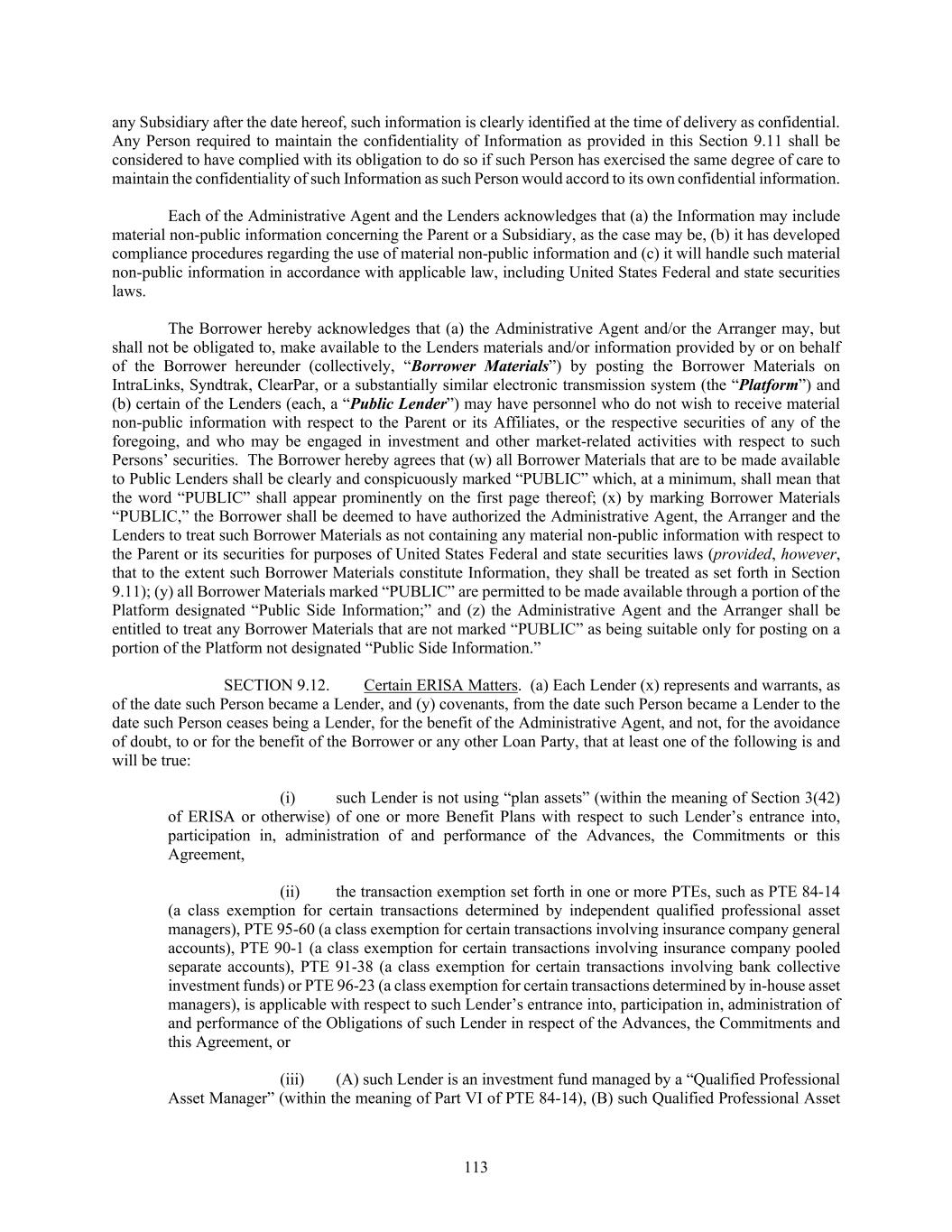 113 any Subsidiary after the date hereof, such information is clearly identified at the time of delivery as confidential. Any Person required to maintain the confidentiality of Information as provided in this Section 9.11 shall be considered to have complied with its obligation to do so if such Person has exercised the same degree of care to maintain the confidentiality of such Information as such Person would accord to its own confidential information. Each of the Administrative Agent and the Lenders acknowledges that (a) the Information may include material non-public information concerning the Parent or a Subsidiary, as the case may be, (b) it has developed compliance procedures regarding the use of material non-public information and (c) it will handle such material non-public information in accordance with applicable law, including United States Federal and state securities laws. The Borrower hereby acknowledges that (a) the Administrative Agent and/or the Arranger may, but shall not be obligated to, make available to the Lenders materials and/or information provided by or on behalf of the Borrower hereunder (collectively, “Borrower Materials”) by posting the Borrower Materials on IntraLinks, Syndtrak, ClearPar, or a substantially similar electronic transmission system (the “Platform”) and (b) certain of the Lenders (each, a “Public Lender”) may have personnel who do not wish to receive material non-public information with respect to the Parent or its Affiliates, or the respective securities of any of the foregoing, and who may be engaged in investment and other market-related activities with respect to such Persons’ securities. The Borrower hereby agrees that (w) all Borrower Materials that are to be made available to Public Lenders shall be clearly and conspicuously marked “PUBLIC” which, at a minimum, shall mean that the word “PUBLIC” shall appear prominently on the first page thereof; (x) by marking Borrower Materials “PUBLIC,” the Borrower shall be deemed to have authorized the Administrative Agent, the Arranger and the Lenders to treat such Borrower Materials as not containing any material non-public information with respect to the Parent or its securities for purposes of United States Federal and state securities laws (provided, however, that to the extent such Borrower Materials constitute Information, they shall be treated as set forth in Section 9.11); (y) all Borrower Materials marked “PUBLIC” are permitted to be made available through a portion of the Platform designated “Public Side Information;” and (z) the Administrative Agent and the Arranger shall be entitled to treat any Borrower Materials that are not marked “PUBLIC” as being suitable only for posting on a portion of the Platform not designated “Public Side Information.” SECTION 9.12. Certain ERISA Matters. (a) Each Lender (x) represents and warrants, as of the date such Person became a Lender, and (y) covenants, from the date such Person became a Lender to the date such Person ceases being a Lender, for the benefit of the Administrative Agent, and not, for the avoidance of doubt, to or for the benefit of the Borrower or any other Loan Party, that at least one of the following is and will be true: (i) such Lender is not using “plan assets” (within the meaning of Section 3(42) of ERISA or otherwise) of one or more Benefit Plans with respect to such Lender’s entrance into, participation in, administration of and performance of the Advances, the Commitments or this Agreement, (ii) the transaction exemption set forth in one or more PTEs, such as PTE 84-14 (a class exemption for certain transactions determined by independent qualified professional asset managers), PTE 95-60 (a class exemption for certain transactions involving insurance company general accounts), PTE 90-1 (a class exemption for certain transactions involving insurance company pooled separate accounts), PTE 91-38 (a class exemption for certain transactions involving bank collective investment funds) or PTE 96-23 (a class exemption for certain transactions determined by in-house asset managers), is applicable with respect to such Lender’s entrance into, participation in, administration of and performance of the Obligations of such Lender in respect of the Advances, the Commitments and this Agreement, or (iii) (A) such Lender is an investment fund managed by a “Qualified Professional Asset Manager” (within the meaning of Part VI of PTE 84-14), (B) such Qualified Professional Asset