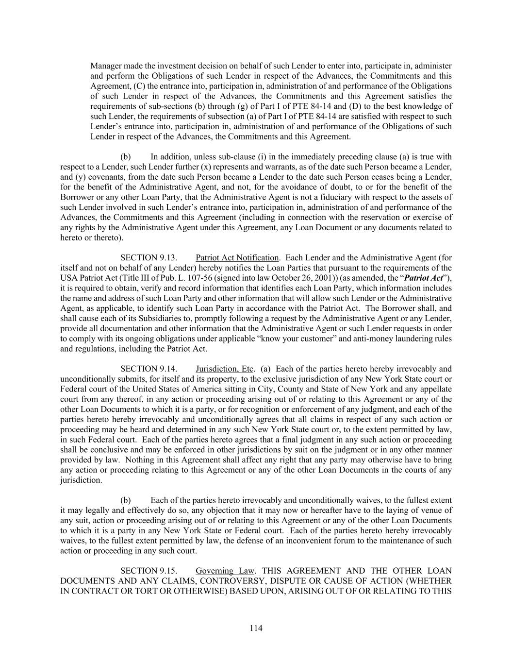 114 Manager made the investment decision on behalf of such Lender to enter into, participate in, administer and perform the Obligations of such Lender in respect of the Advances, the Commitments and this Agreement, (C) the entrance into, participation in, administration of and performance of the Obligations of such Lender in respect of the Advances, the Commitments and this Agreement satisfies the requirements of sub-sections (b) through (g) of Part I of PTE 84-14 and (D) to the best knowledge of such Lender, the requirements of subsection (a) of Part I of PTE 84-14 are satisfied with respect to such Lender’s entrance into, participation in, administration of and performance of the Obligations of such Lender in respect of the Advances, the Commitments and this Agreement. (b) In addition, unless sub-clause (i) in the immediately preceding clause (a) is true with respect to a Lender, such Lender further (x) represents and warrants, as of the date such Person became a Lender, and (y) covenants, from the date such Person became a Lender to the date such Person ceases being a Lender, for the benefit of the Administrative Agent, and not, for the avoidance of doubt, to or for the benefit of the Borrower or any other Loan Party, that the Administrative Agent is not a fiduciary with respect to the assets of such Lender involved in such Lender’s entrance into, participation in, administration of and performance of the Advances, the Commitments and this Agreement (including in connection with the reservation or exercise of any rights by the Administrative Agent under this Agreement, any Loan Document or any documents related to hereto or thereto). SECTION 9.13. Patriot Act Notification. Each Lender and the Administrative Agent (for itself and not on behalf of any Lender) hereby notifies the Loan Parties that pursuant to the requirements of the USA Patriot Act (Title III of Pub. L. 107-56 (signed into law October 26, 2001)) (as amended, the “Patriot Act”), it is required to obtain, verify and record information that identifies each Loan Party, which information includes the name and address of such Loan Party and other information that will allow such Lender or the Administrative Agent, as applicable, to identify such Loan Party in accordance with the Patriot Act. The Borrower shall, and shall cause each of its Subsidiaries to, promptly following a request by the Administrative Agent or any Lender, provide all documentation and other information that the Administrative Agent or such Lender requests in order to comply with its ongoing obligations under applicable “know your customer” and anti-money laundering rules and regulations, including the Patriot Act. SECTION 9.14. Jurisdiction, Etc. (a) Each of the parties hereto hereby irrevocably and unconditionally submits, for itself and its property, to the exclusive jurisdiction of any New York State court or Federal court of the United States of America sitting in City, County and State of New York and any appellate court from any thereof, in any action or proceeding arising out of or relating to this Agreement or any of the other Loan Documents to which it is a party, or for recognition or enforcement of any judgment, and each of the parties hereto hereby irrevocably and unconditionally agrees that all claims in respect of any such action or proceeding may be heard and determined in any such New York State court or, to the extent permitted by law, in such Federal court. Each of the parties hereto agrees that a final judgment in any such action or proceeding shall be conclusive and may be enforced in other jurisdictions by suit on the judgment or in any other manner provided by law. Nothing in this Agreement shall affect any right that any party may otherwise have to bring any action or proceeding relating to this Agreement or any of the other Loan Documents in the courts of any jurisdiction. (b) Each of the parties hereto irrevocably and unconditionally waives, to the fullest extent it may legally and effectively do so, any objection that it may now or hereafter have to the laying of venue of any suit, action or proceeding arising out of or relating to this Agreement or any of the other Loan Documents to which it is a party in any New York State or Federal court. Each of the parties hereto hereby irrevocably waives, to the fullest extent permitted by law, the defense of an inconvenient forum to the maintenance of such action or proceeding in any such court. SECTION 9.15. Governing Law. THIS AGREEMENT AND THE OTHER LOAN DOCUMENTS AND ANY CLAIMS, CONTROVERSY, DISPUTE OR CAUSE OF ACTION (WHETHER IN CONTRACT OR TORT OR OTHERWISE) BASED UPON, ARISING OUT OF OR RELATING TO THIS