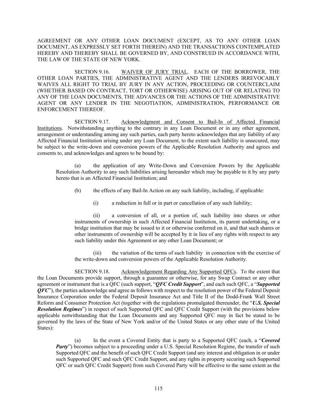 115 AGREEMENT OR ANY OTHER LOAN DOCUMENT (EXCEPT, AS TO ANY OTHER LOAN DOCUMENT, AS EXPRESSLY SET FORTH THEREIN) AND THE TRANSACTIONS CONTEMPLATED HEREBY AND THEREBY SHALL BE GOVERNED BY, AND CONSTRUED IN ACCORDANCE WITH, THE LAW OF THE STATE OF NEW YORK. SECTION 9.16. WAIVER OF JURY TRIAL. EACH OF THE BORROWER, THE OTHER LOAN PARTIES, THE ADMINISTRATIVE AGENT AND THE LENDERS IRREVOCABLY WAIVES ALL RIGHT TO TRIAL BY JURY IN ANY ACTION, PROCEEDING OR COUNTERCLAIM (WHETHER BASED ON CONTRACT, TORT OR OTHERWISE) ARISING OUT OF OR RELATING TO ANY OF THE LOAN DOCUMENTS, THE ADVANCES OR THE ACTIONS OF THE ADMINISTRATIVE AGENT OR ANY LENDER IN THE NEGOTIATION, ADMINISTRATION, PERFORMANCE OR ENFORCEMENT THEREOF. SECTION 9.17. Acknowledgment and Consent to Bail-In of Affected Financial Institutions. Notwithstanding anything to the contrary in any Loan Document or in any other agreement, arrangement or understanding among any such parties, each party hereto acknowledges that any liability of any Affected Financial Institution arising under any Loan Document, to the extent such liability is unsecured, may be subject to the write-down and conversion powers of the Applicable Resolution Authority and agrees and consents to, and acknowledges and agrees to be bound by: (a) the application of any Write-Down and Conversion Powers by the Applicable Resolution Authority to any such liabilities arising hereunder which may be payable to it by any party hereto that is an Affected Financial Institution; and (b) the effects of any Bail-In Action on any such liability, including, if applicable: (i) a reduction in full or in part or cancellation of any such liability; (ii) a conversion of all, or a portion of, such liability into shares or other instruments of ownership in such Affected Financial Institution, its parent undertaking, or a bridge institution that may be issued to it or otherwise conferred on it, and that such shares or other instruments of ownership will be accepted by it in lieu of any rights with respect to any such liability under this Agreement or any other Loan Document; or (iii) the variation of the terms of such liability in connection with the exercise of the write-down and conversion powers of the Applicable Resolution Authority. SECTION 9.18. Acknowledgement Regarding Any Supported QFCs. To the extent that the Loan Documents provide support, through a guarantee or otherwise, for any Swap Contract or any other agreement or instrument that is a QFC (such support, “QFC Credit Support”, and each such QFC, a “Supported QFC”), the parties acknowledge and agree as follows with respect to the resolution power of the Federal Deposit Insurance Corporation under the Federal Deposit Insurance Act and Title II of the Dodd-Frank Wall Street Reform and Consumer Protection Act (together with the regulations promulgated thereunder, the “U.S. Special Resolution Regimes”) in respect of such Supported QFC and QFC Credit Support (with the provisions below applicable notwithstanding that the Loan Documents and any Supported QFC may in fact be stated to be governed by the laws of the State of New York and/or of the United States or any other state of the United States): (a) In the event a Covered Entity that is party to a Supported QFC (each, a “Covered Party”) becomes subject to a proceeding under a U.S. Special Resolution Regime, the transfer of such Supported QFC and the benefit of such QFC Credit Support (and any interest and obligation in or under such Supported QFC and such QFC Credit Support, and any rights in property securing such Supported QFC or such QFC Credit Support) from such Covered Party will be effective to the same extent as the