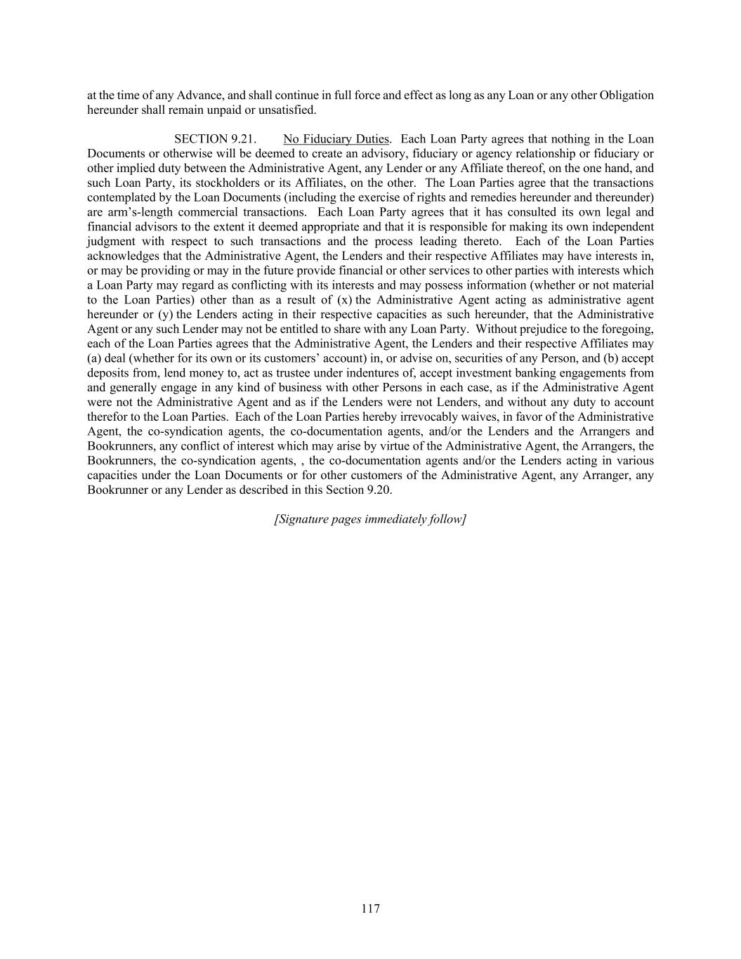 117 at the time of any Advance, and shall continue in full force and effect as long as any Loan or any other Obligation hereunder shall remain unpaid or unsatisfied. SECTION 9.21. No Fiduciary Duties. Each Loan Party agrees that nothing in the Loan Documents or otherwise will be deemed to create an advisory, fiduciary or agency relationship or fiduciary or other implied duty between the Administrative Agent, any Lender or any Affiliate thereof, on the one hand, and such Loan Party, its stockholders or its Affiliates, on the other. The Loan Parties agree that the transactions contemplated by the Loan Documents (including the exercise of rights and remedies hereunder and thereunder) are arm’s-length commercial transactions. Each Loan Party agrees that it has consulted its own legal and financial advisors to the extent it deemed appropriate and that it is responsible for making its own independent judgment with respect to such transactions and the process leading thereto. Each of the Loan Parties acknowledges that the Administrative Agent, the Lenders and their respective Affiliates may have interests in, or may be providing or may in the future provide financial or other services to other parties with interests which a Loan Party may regard as conflicting with its interests and may possess information (whether or not material to the Loan Parties) other than as a result of (x) the Administrative Agent acting as administrative agent hereunder or (y) the Lenders acting in their respective capacities as such hereunder, that the Administrative Agent or any such Lender may not be entitled to share with any Loan Party. Without prejudice to the foregoing, each of the Loan Parties agrees that the Administrative Agent, the Lenders and their respective Affiliates may (a) deal (whether for its own or its customers’ account) in, or advise on, securities of any Person, and (b) accept deposits from, lend money to, act as trustee under indentures of, accept investment banking engagements from and generally engage in any kind of business with other Persons in each case, as if the Administrative Agent were not the Administrative Agent and as if the Lenders were not Lenders, and without any duty to account therefor to the Loan Parties. Each of the Loan Parties hereby irrevocably waives, in favor of the Administrative Agent, the co-syndication agents, the co-documentation agents, and/or the Lenders and the Arrangers and Bookrunners, any conflict of interest which may arise by virtue of the Administrative Agent, the Arrangers, the Bookrunners, the co-syndication agents, , the co-documentation agents and/or the Lenders acting in various capacities under the Loan Documents or for other customers of the Administrative Agent, any Arranger, any Bookrunner or any Lender as described in this Section 9.20. [Signature pages immediately follow]