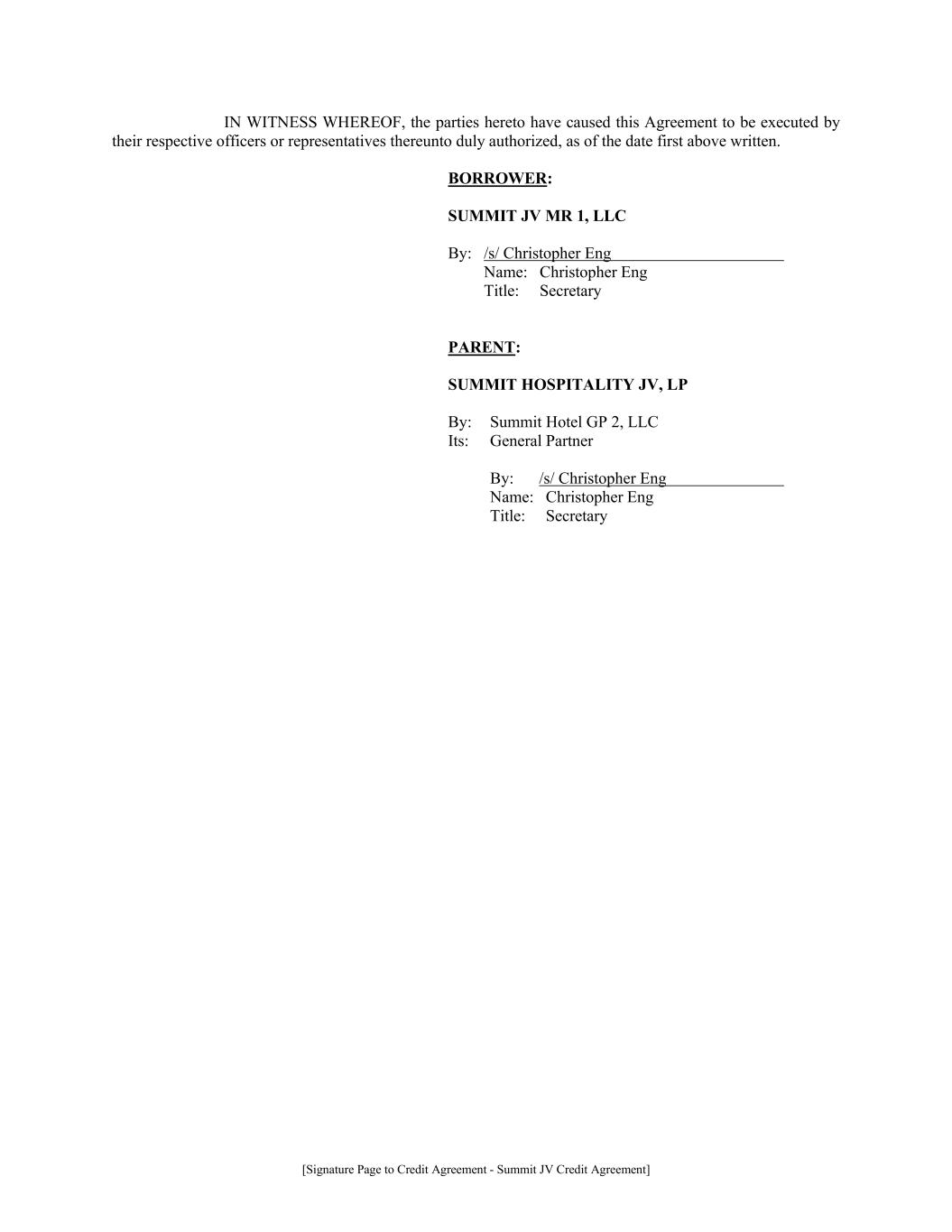 [Signature Page to Credit Agreement - Summit JV Credit Agreement] IN WITNESS WHEREOF, the parties hereto have caused this Agreement to be executed by their respective officers or representatives thereunto duly authorized, as of the date first above written. BORROWER: SUMMIT JV MR 1, LLC By: /s/ Christopher Eng Name: Christopher Eng Title: Secretary PARENT: SUMMIT HOSPITALITY JV, LP By: Summit Hotel GP 2, LLC Its: General Partner By: /s/ Christopher Eng Name: Christopher Eng Title: Secretary