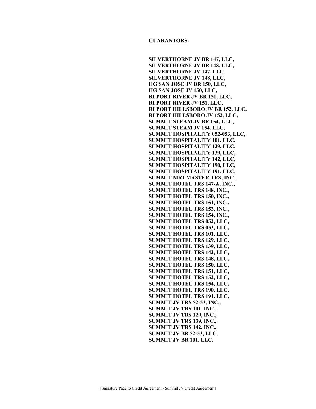 [Signature Page to Credit Agreement - Summit JV Credit Agreement] GUARANTORS: SILVERTHORNE JV BR 147, LLC, SILVERTHORNE JV BR 148, LLC, SILVERTHORNE JV 147, LLC, SILVERTHORNE JV 148, LLC, HG SAN JOSE JV BR 150, LLC, HG SAN JOSE JV 150, LLC, RI PORT RIVER JV BR 151, LLC, RI PORT RIVER JV 151, LLC, RI PORT HILLSBORO JV BR 152, LLC, RI PORT HILLSBORO JV 152, LLC, SUMMIT STEAM JV BR 154, LLC, SUMMIT STEAM JV 154, LLC, SUMMIT HOSPITALITY 052-053, LLC, SUMMIT HOSPITALITY 101, LLC, SUMMIT HOSPITALITY 129, LLC, SUMMIT HOSPITALITY 139, LLC, SUMMIT HOSPITALITY 142, LLC, SUMMIT HOSPITALITY 190, LLC, SUMMIT HOSPITALITY 191, LLC, SUMMIT MR1 MASTER TRS, INC., SUMMIT HOTEL TRS 147-A, INC., SUMMIT HOTEL TRS 148, INC., SUMMIT HOTEL TRS 150, INC., SUMMIT HOTEL TRS 151, INC., SUMMIT HOTEL TRS 152, INC., SUMMIT HOTEL TRS 154, INC., SUMMIT HOTEL TRS 052, LLC, SUMMIT HOTEL TRS 053, LLC, SUMMIT HOTEL TRS 101, LLC, SUMMIT HOTEL TRS 129, LLC, SUMMIT HOTEL TRS 139, LLC, SUMMIT HOTEL TRS 142, LLC, SUMMIT HOTEL TRS 148, LLC, SUMMIT HOTEL TRS 150, LLC, SUMMIT HOTEL TRS 151, LLC, SUMMIT HOTEL TRS 152, LLC, SUMMIT HOTEL TRS 154, LLC, SUMMIT HOTEL TRS 190, LLC, SUMMIT HOTEL TRS 191, LLC, SUMMIT JV TRS 52-53, INC., SUMMIT JV TRS 101, INC., SUMMIT JV TRS 129, INC., SUMMIT JV TRS 139, INC., SUMMIT JV TRS 142, INC., SUMMIT JV BR 52-53, LLC, SUMMIT JV BR 101, LLC,