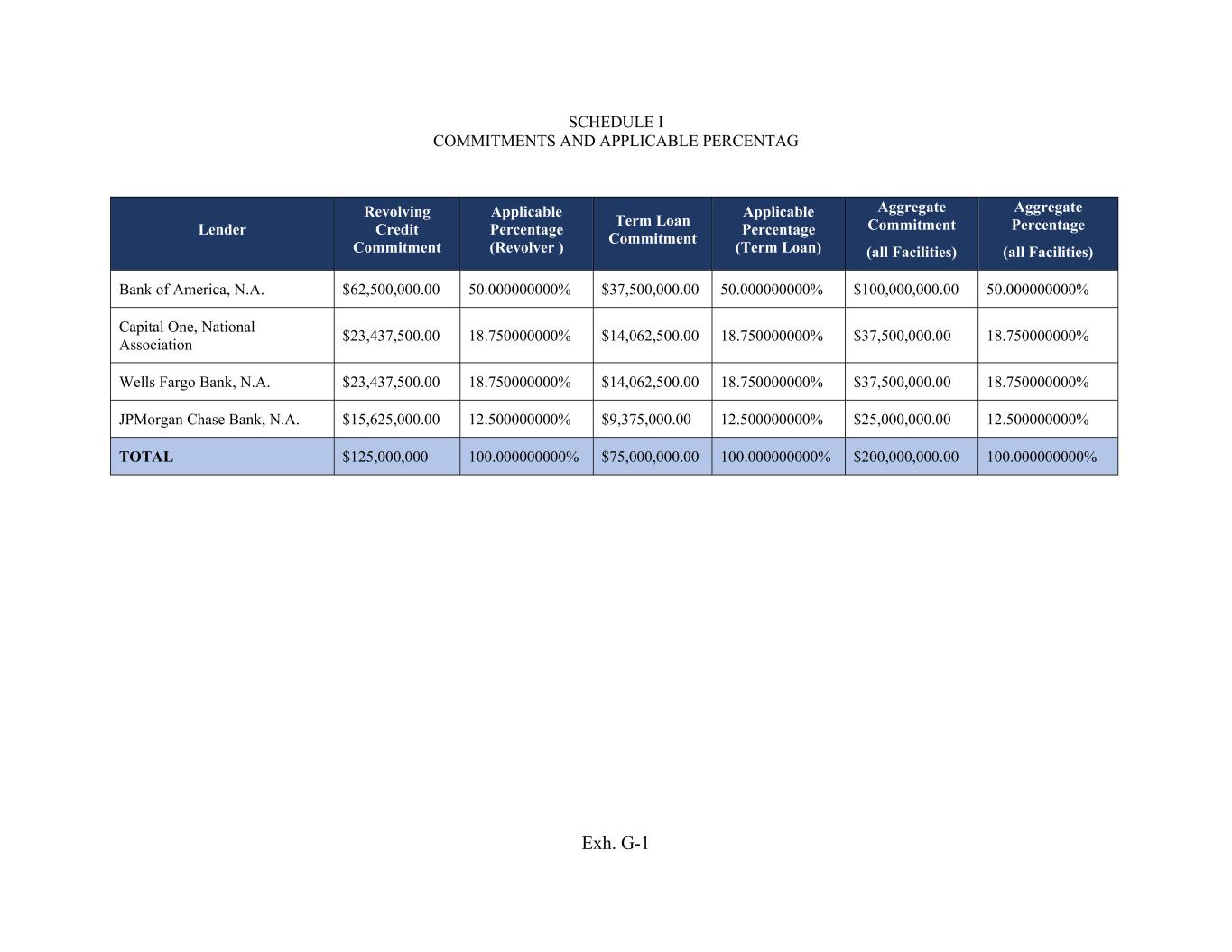 Exh. G-1 SCHEDULE I COMMITMENTS AND APPLICABLE PERCENTAG Lender Revolving Credit Commitment Applicable Percentage (Revolver ) Term Loan Commitment Applicable Percentage (Term Loan) Aggregate Commitment (all Facilities) Aggregate Percentage (all Facilities) Bank of America, N.A. $62,500,000.00 50.000000000% $37,500,000.00 50.000000000% $100,000,000.00 50.000000000% Capital One, National Association $23,437,500.00 18.750000000% $14,062,500.00 18.750000000% $37,500,000.00 18.750000000% Wells Fargo Bank, N.A. $23,437,500.00 18.750000000% $14,062,500.00 18.750000000% $37,500,000.00 18.750000000% JPMorgan Chase Bank, N.A. $15,625,000.00 12.500000000% $9,375,000.00 12.500000000% $25,000,000.00 12.500000000% TOTAL $125,000,000 100.000000000% $75,000,000.00 100.000000000% $200,000,000.00 100.000000000%
