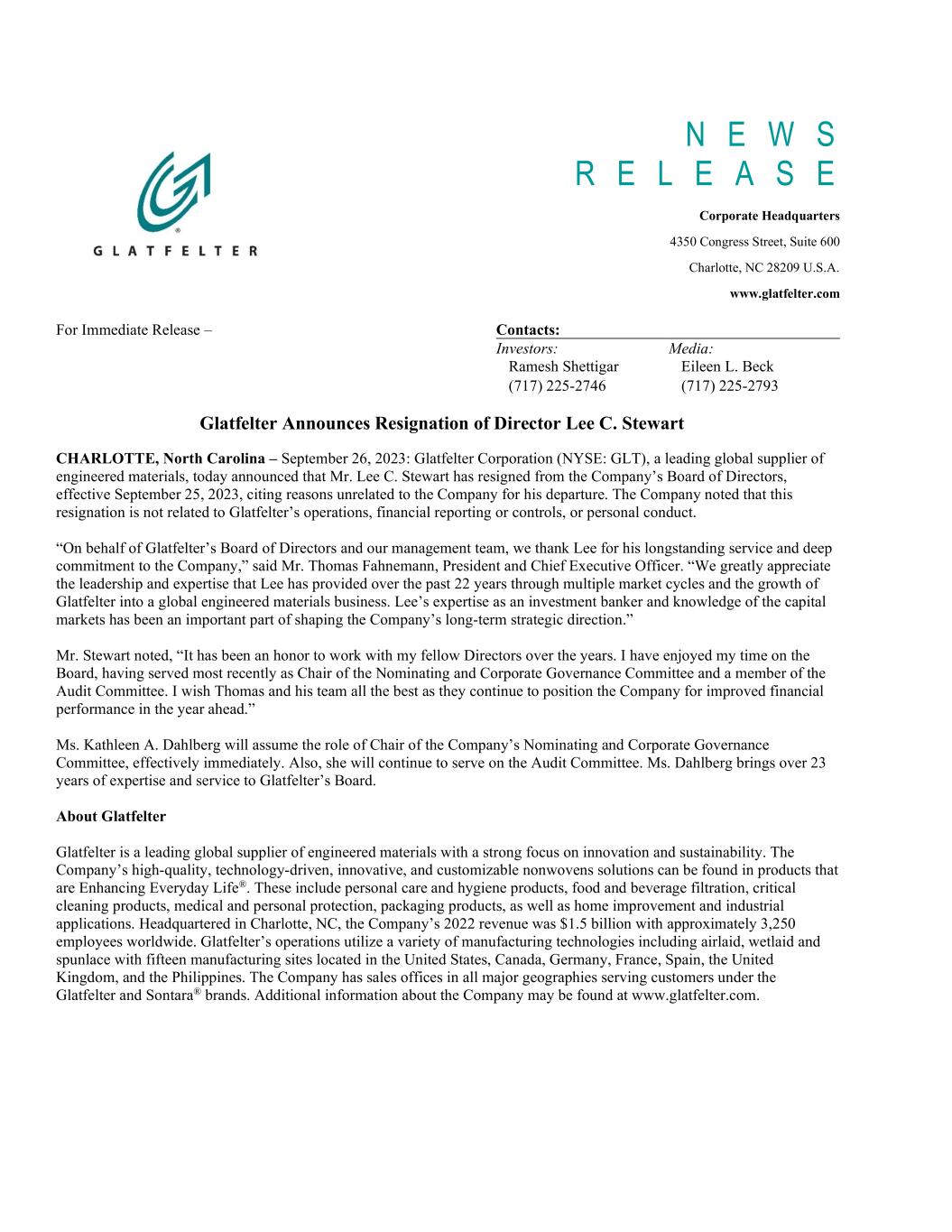 N E W S R E L E A S E Corporate Headquarters 4350 Congress Street, Suite 600 Charlotte, NC 28209 U.S.A. www.glatfelter.com For Immediate Release – Contacts: Investors: Media: Ramesh Shettigar Eileen L. Beck (717) 225-2746 (717) 225-2793 Glatfelter Announces Resignation of Director Lee C. Stewart CHARLOTTE, North Carolina – September 26, 2023: Glatfelter Corporation (NYSE: GLT), a leading global supplier of engineered materials, today announced that Mr. Lee C. Stewart has resigned from the Company’s Board of Directors, effective September 25, 2023, citing reasons unrelated to the Company for his departure. The Company noted that this resignation is not related to Glatfelter’s operations, financial reporting or controls, or personal conduct. “On behalf of Glatfelter’s Board of Directors and our management team, we thank Lee for his longstanding service and deep commitment to the Company,” said Mr. Thomas Fahnemann, President and Chief Executive Officer. “We greatly appreciate the leadership and expertise that Lee has provided over the past 22 years through multiple market cycles and the growth of Glatfelter into a global engineered materials business. Lee’s expertise as an investment banker and knowledge of the capital markets has been an important part of shaping the Company’s long-term strategic direction.” Mr. Stewart noted, “It has been an honor to work with my fellow Directors over the years. I have enjoyed my time on the Board, having served most recently as Chair of the Nominating and Corporate Governance Committee and a member of the Audit Committee. I wish Thomas and his team all the best as they continue to position the Company for improved financial performance in the year ahead.” Ms. Kathleen A. Dahlberg will assume the role of Chair of the Company’s Nominating and Corporate Governance Committee, effectively immediately. Also, she will continue to serve on the Audit Committee. Ms. Dahlberg brings over 23 years of expertise and service to Glatfelter’s Board. About Glatfelter Glatfelter is a leading global supplier of engineered materials with a strong focus on innovation and sustainability. The Company’s high-quality, technology-driven, innovative, and customizable nonwovens solutions can be found in products that are Enhancing Everyday Life®. These include personal care and hygiene products, food and beverage filtration, critical cleaning products, medical and personal protection, packaging products, as well as home improvement and industrial applications. Headquartered in Charlotte, NC, the Company’s 2022 revenue was $1.5 billion with approximately 3,250 employees worldwide. Glatfelter’s operations utilize a variety of manufacturing technologies including airlaid, wetlaid and spunlace with fifteen manufacturing sites located in the United States, Canada, Germany, France, Spain, the United Kingdom, and the Philippines. The Company has sales offices in all major geographies serving customers under the Glatfelter and Sontara® brands. Additional information about the Company may be found at www.glatfelter.com.