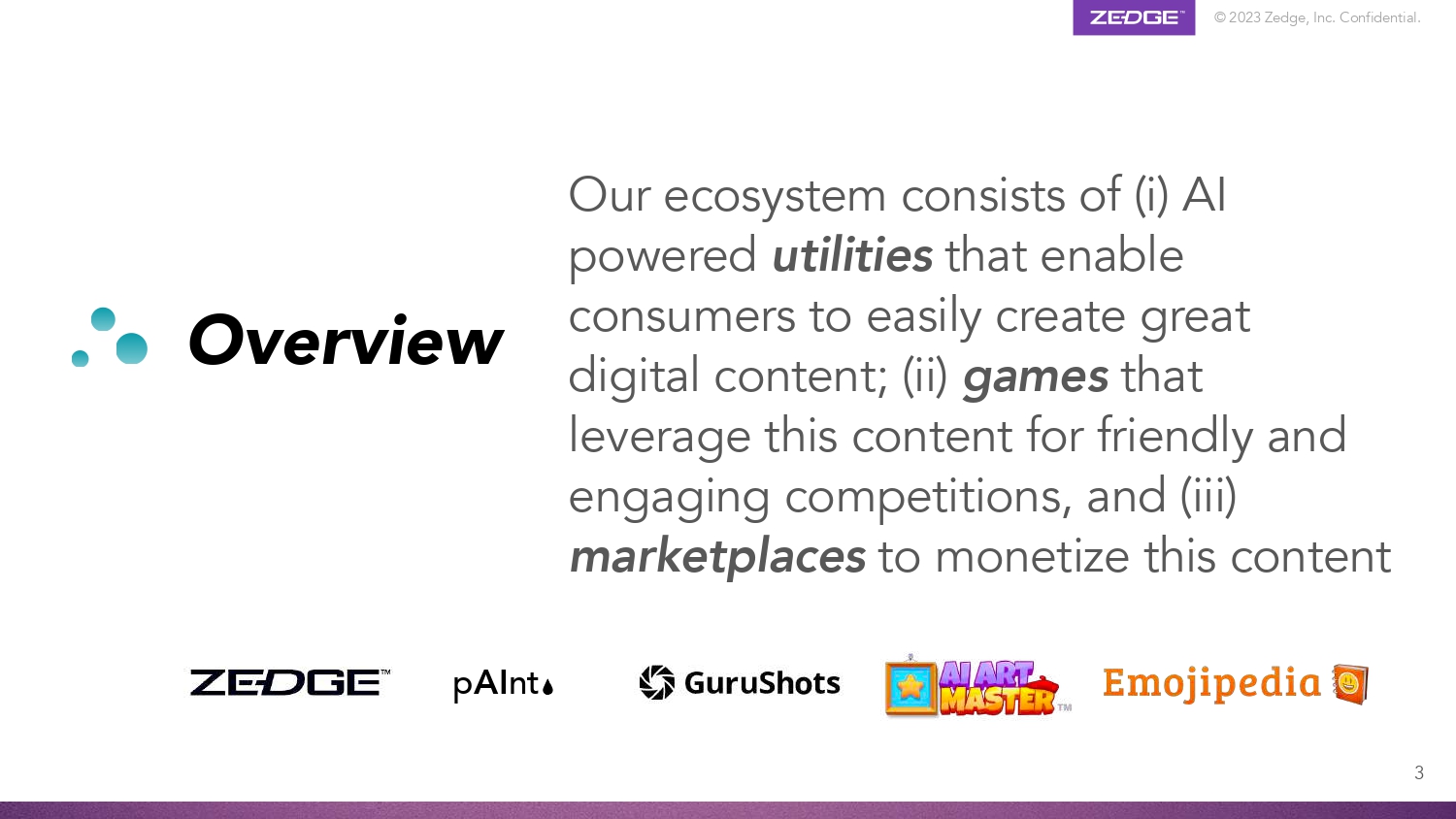 © 2023 Zedge, Inc. Confidential. 2 This presentation contains statements that are, or may be considered to be, forward - looking statements. All statements that are not historical facts are forward - looking statements and such forward - looking statements are statements made pursuant to the Safe Harbor Provisions of the Private Securities Litigation Reform Act of 1995. Examples of forward - looking statements include: • statements about Zedge’s future performance; • projections of Zedge’s results of operations or financial condition; • statements regarding Zedge’s plans, objectives or goals, including those relating to its strategies ,initiatives, competition, acquisitions, dispositions and/or its products; and Words such as "believe," "anticipate," "plan," "expect," "intend," "target," "estimate," "project," "predict," "forecast," "guideline," "aim," "will," "should," “likely,” "continue" and similar expressions are intended to identify forward - looking statements but are not the exclusive means of identifying such statements. Readers are cautioned not to place undue reliance on these forward - looking statements and all such forward - looking statements are qualified in their entirety by reference to the following cautionary statements. Forward - looking statements are based on Zedge’s current expectations, estimates and assumptions and because forward - looking statements address future results, events and conditions, they, by their very nature, involve inherent risks and uncertainties, many of which are unforeseeable and beyond Zedge’s control. Such known and unknown risks, uncertainties and other factors may cause Zedge’s actual results, performance or other achievements to differ materially from the anticipated results, performance or achievements expressed, projected or implied by these forward - looking statements. These factors include those discussed under the headings "Risk Factors" and “Management’s Discussion and Analysis of Financial Condition and Results of Operations” in Zedge’s periodic reports filed with the Securities and Exchange Commission. Zedge cautions that such factors are not exhaustive and that other risks and uncertainties may cause actual results to differ materially from those in forward - looking statements. Forward - looking statements speak only as of the date they are made and are statements of current expectations concerning future results, events and conditions and Zedge is under no obligation to update any of the forward - looking statements, whether as a result of new information, future events or otherwise. Safe harbor statement