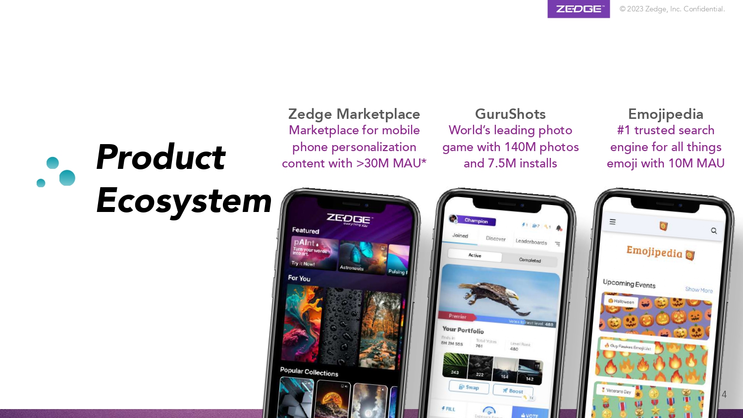 © 2023 Zedge, Inc. Confidential. Overview Our ecosystem consists of (i) AI powered utilities that enable consumers to easily create great digital content; (ii) games that leverage this content for friendly and engaging competitions, and (iii) marketplaces to monetize this content p AI nt 3