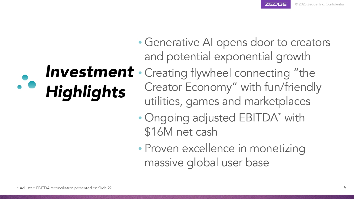 © 2023 Zedge, Inc. Confidential. Product Ecosystem GuruShots World’s leading photo game with 140M photos and 7.5M installs 4 Zedge Marketplace Marketplace for mobile phone personalization content with >30M MAU* Emojipedia #1 trusted search engine for all things emoji with 10M MAU