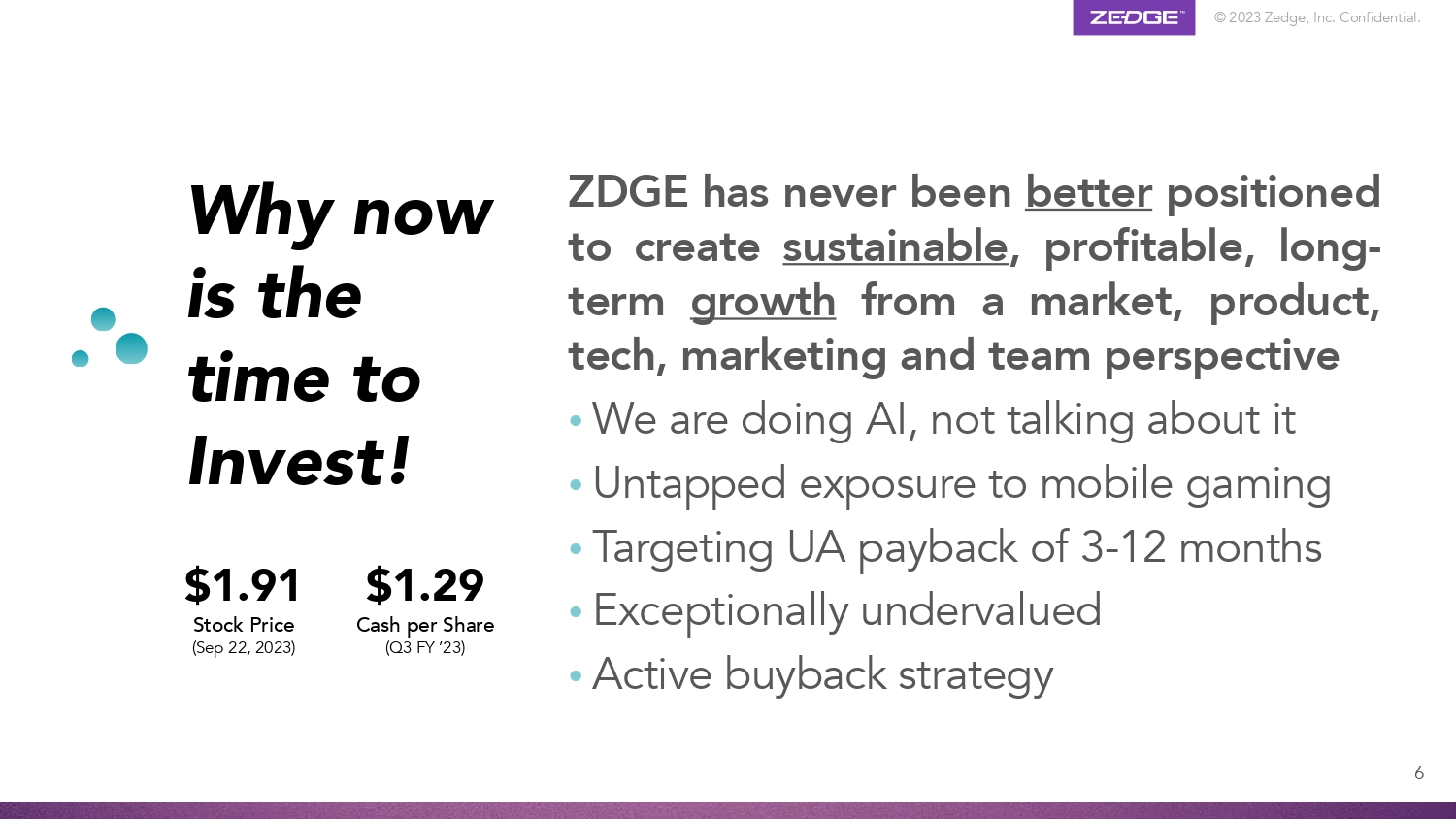 © 2023 Zedge, Inc. Confidential. utilities, games and marketplaces • Ongoing adjusted EBITDA * with $16M net cash • Proven excellence in monetizing massive global user base • Generative AI opens door to creators and potential exponential growth Investment • Creating flywheel connecting “the Creator Economy” with fun/friendly 5 Highlights * Adjusted EBITDA reconciliation presented on Slide 22