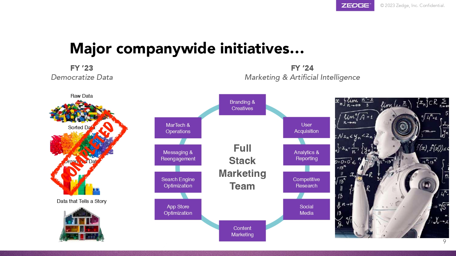 © 2023 Zedge, Inc. Confidential. Major companywide initiatives… FY ’23 Democratize Data Branding & Creatives Competitive Research Search Engine Optimization User Acquisition MarTech & Operations Analytics & Reporting Messaging & Reengagement Social Media App Store Optimization Content Marketing Full Stack Marketing Team Raw Data Sorted Data Organized Data Data that Tells a Story FY ’24 Marketing & Artificial Intelligence 9