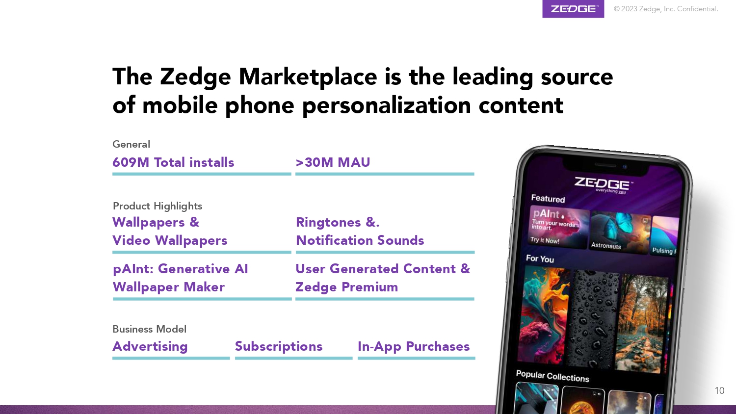 © 2023 Zedge, Inc. Confidential. The Zedge Marketplace is the leading source of mobile phone personalization content Business Model Advertising Subscriptions In - App Purchases General 609M Total installs >30M MAU pAInt: Generative AI Wallpaper Maker User Generated Content & Zedge Premium Product Highlights Wallpapers & Video Wallpapers Ringtones &. Notification Sounds 10