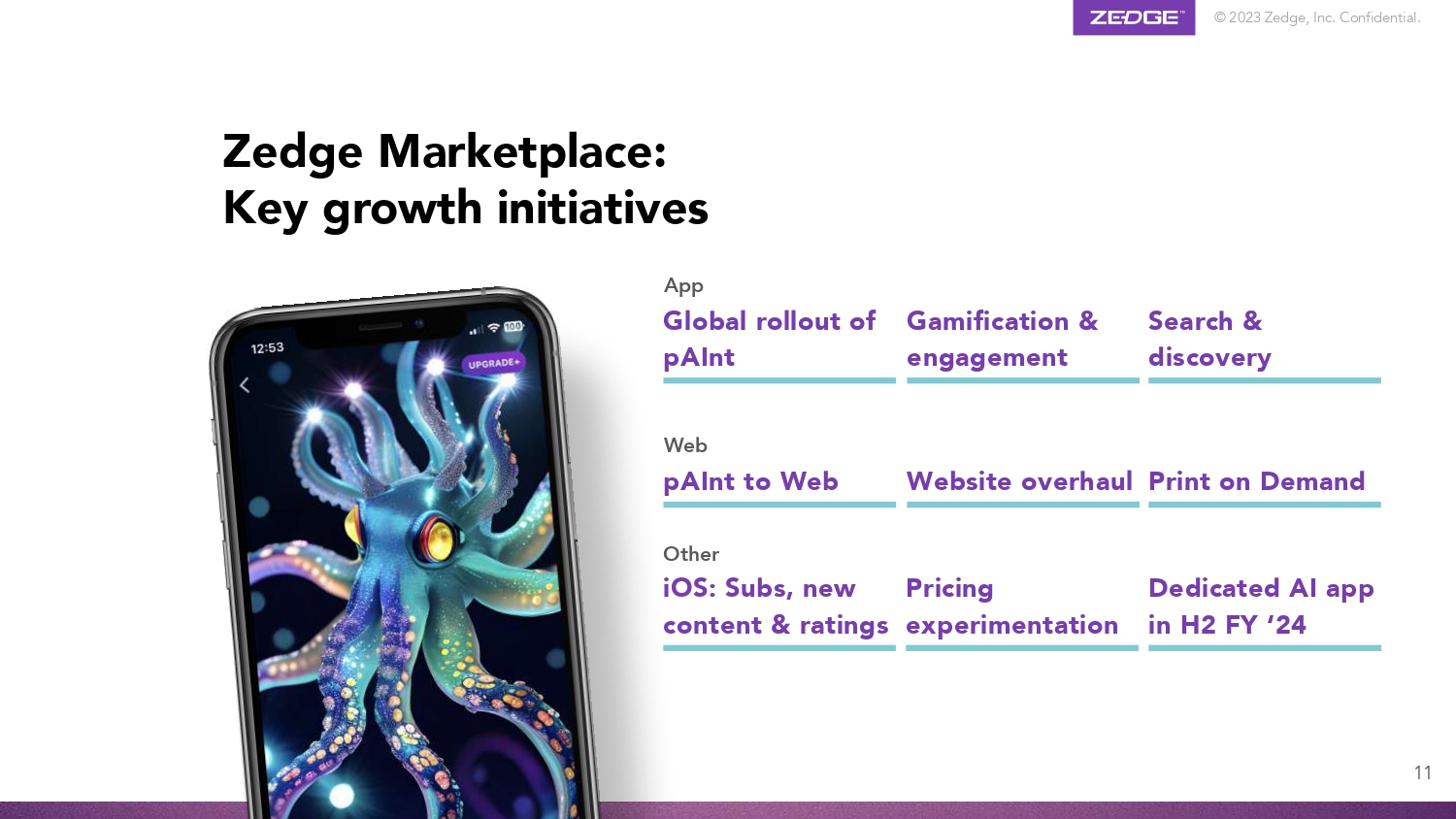 © 2023 Zedge, Inc. Confidential. Zedge Marketplace: Key growth initiatives Other iOS: Subs, new Pricing content & ratings experimentation Dedicated AI app in H2 FY ‘24 App Global rollout of pAInt Gamification & engagement Search & discovery Web pAInt to Web Website overhaul Print on Demand 11