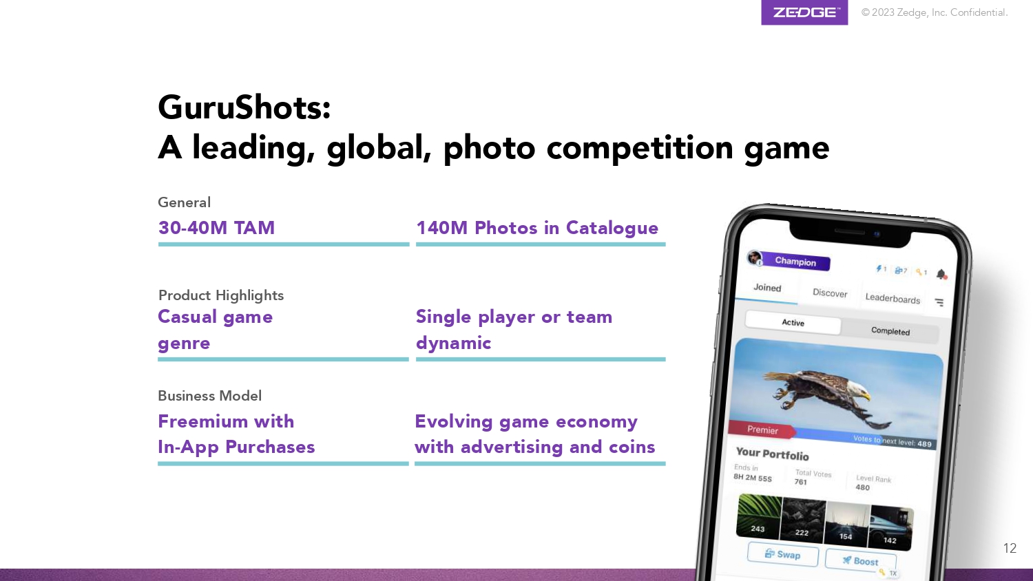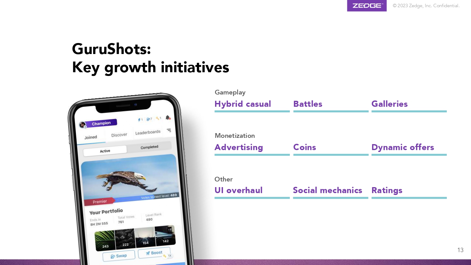 © 2023 Zedge, Inc. Confidential. Product Highlights Casual game genre Single player or team dynamic General 30 - 40M TAM 140M Photos in Catalogue Business Model Freemium with In - App Purchases Evolving game economy with advertising and coins GuruShots: A leading, global, photo competition game 12