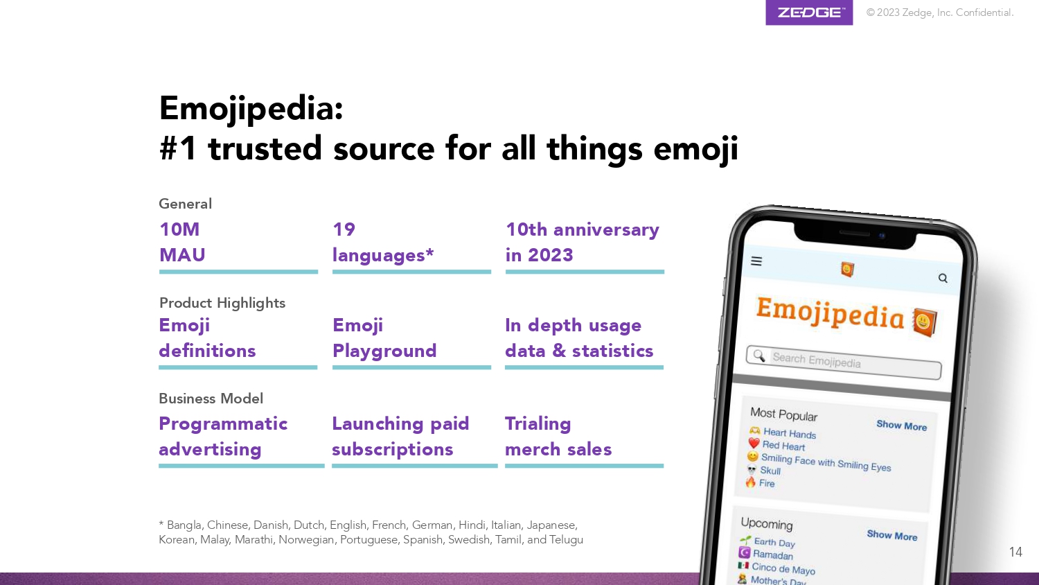 © 2023 Zedge, Inc. Confidential. Trialing merch sales Business Model Programmatic advertising Launching paid subscriptions * Bangla, Chinese, Danish, Dutch, English, French, German, Hindi, Italian, Japanese, Korean, Malay, Marathi, Norwegian, Portuguese, Spanish, Swedish, Tamil, and Telugu Product Highlights Emoji definitions Emoji Playground In depth usage data & statistics 10M MAU 19 languages* 10th anniversary in 2023 General Emojipedia: #1 trusted source for all things emoji 14