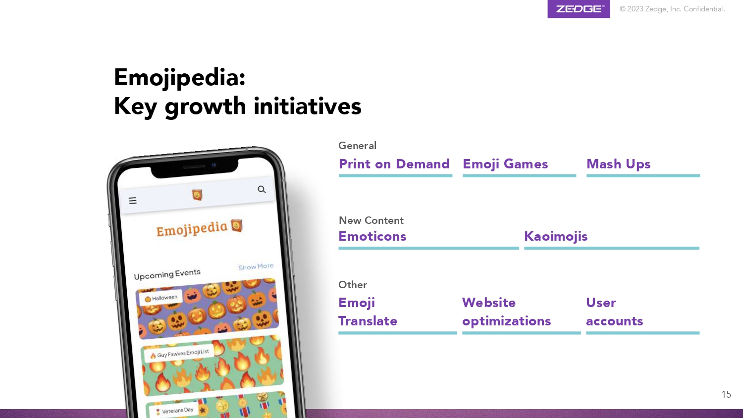 © 2023 Zedge, Inc. Confidential. User accounts Other Emoji Translate Website optimizations New Content Emoticons Kaoimojis General Print on Demand Emoji Games Mash Ups Emojipedia: Key growth initiatives 15