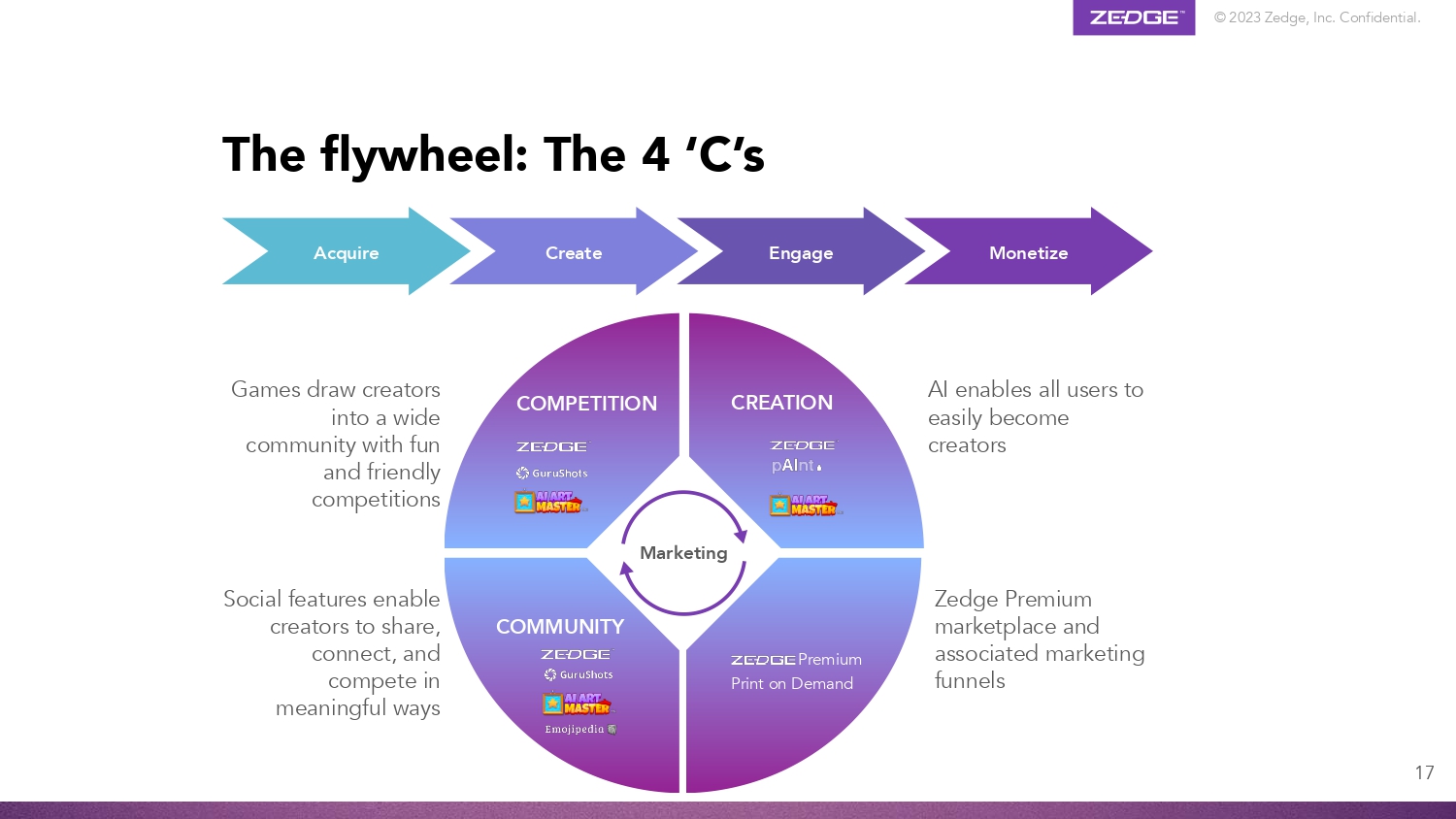 © 2023 Zedge, Inc. Confidential. AI Art Master: Hybrid Casual Gen AI game • Gen AI creation tool • 1v1 voting dynamic with • Audio and haptics • Meta game • Coin based economy • Multiple monetization opportunities 16