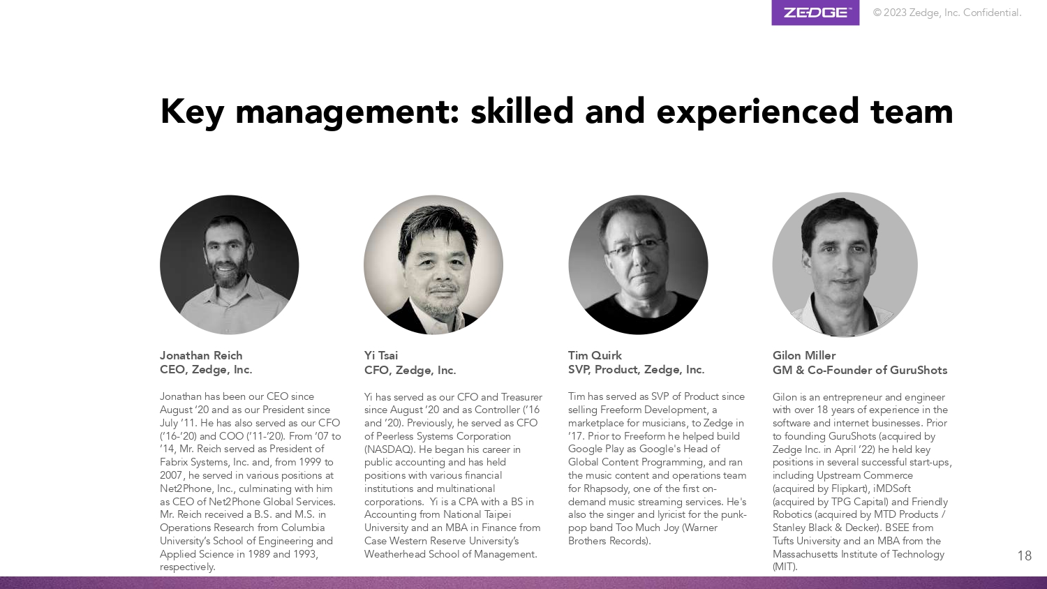 © 2023 Zedge, Inc. Confidential. 18 Jonathan Reich CEO, Zedge, Inc. Jonathan has been our CEO since August ‘20 and as our President since July ’11. He has also served as our CFO (’16 - ’20) and COO (’11 - ’20). From ’07 to ’14, Mr. Reich served as President of Fabrix Systems, Inc. and, from 1999 to 2007, he served in various positions at Net2Phone, Inc., culminating with him as CEO of Net2Phone Global Services. Mr. Reich received a B.S. and M.S. in Operations Research from Columbia University’s School of Engineering and Applied Science in 1989 and 1993, respectively. Yi Tsai CFO, Zedge, Inc. Yi has served as our CFO and Treasurer since August ’20 and as Controller (’16 and ’20). Previously, he served as CFO of Peerless Systems Corporation (NASDAQ). He began his career in public accounting and has held positions with various financial institutions and multinational corporations. Yi is a CPA with a BS in Accounting from National Taipei University and an MBA in Finance from Case Western Reserve University’s Weatherhead School of Management. Tim Quirk SVP, Product, Zedge, Inc. Tim has served as SVP of Product since selling Freeform Development, a marketplace for musicians, to Zedge in ’17. Prior to Freeform he helped build Google Play as Google's Head of Global Content Programming, and ran the music content and operations team for Rhapsody, one of the first on - demand music streaming services. He's also the singer and lyricist for the punk - pop band Too Much Joy (Warner Brothers Records). Key management: skilled and experienced team Gilon Miller GM & Co - Founder of GuruShots Gilon is an entrepreneur and engineer with over 18 years of experience in the software and internet businesses. Prior to founding GuruShots (acquired by Zedge Inc. in April ’22) he held key positions in several successful start - ups, including Upstream Commerce (acquired by Flipkart), iMDSoft (acquired by TPG Capital) and Friendly Robotics (acquired by MTD Products / Stanley Black & Decker). BSEE from Tufts University and an MBA from the Massachusetts Institute of Technology (MIT).