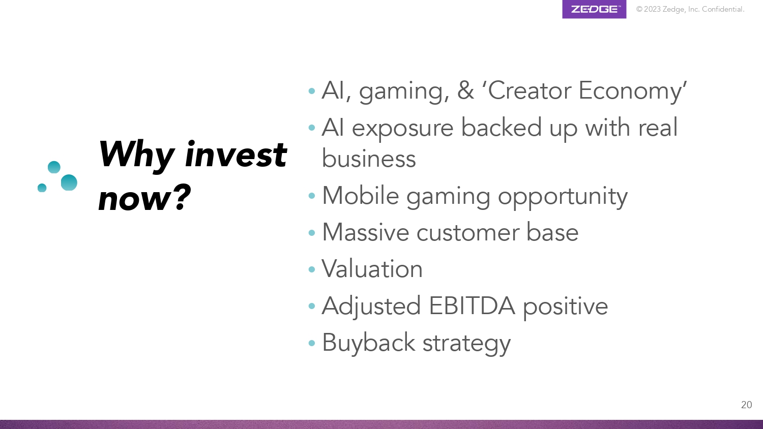 © 2023 Zedge, Inc. Confidential. 20 Why invest now? • AI, gaming, & ‘Creator Economy’ • AI exposure backed up with real business • Mobile gaming opportunity • Massive customer base • Valuation • Adjusted EBITDA positive • Buyback strategy
