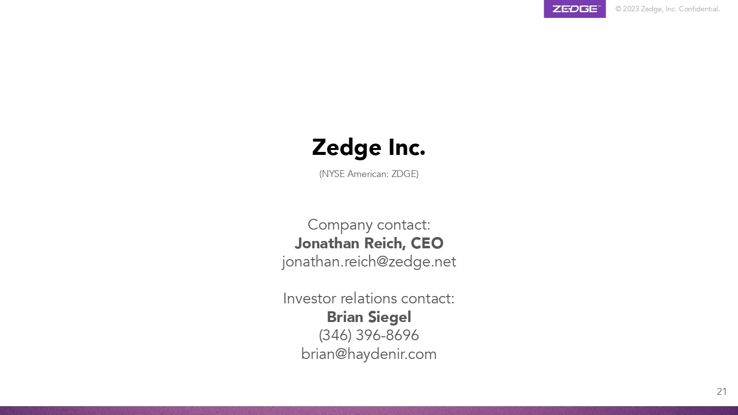 © 2023 Zedge, Inc. Confidential. 21 Zedge Inc. Company contact: Jonathan Reich, CEO jonathan.reich@zedge.net Investor relations contact: Brian Siegel (346) 396 - 8696 brian@haydenir.com (NYSE American: ZDGE)