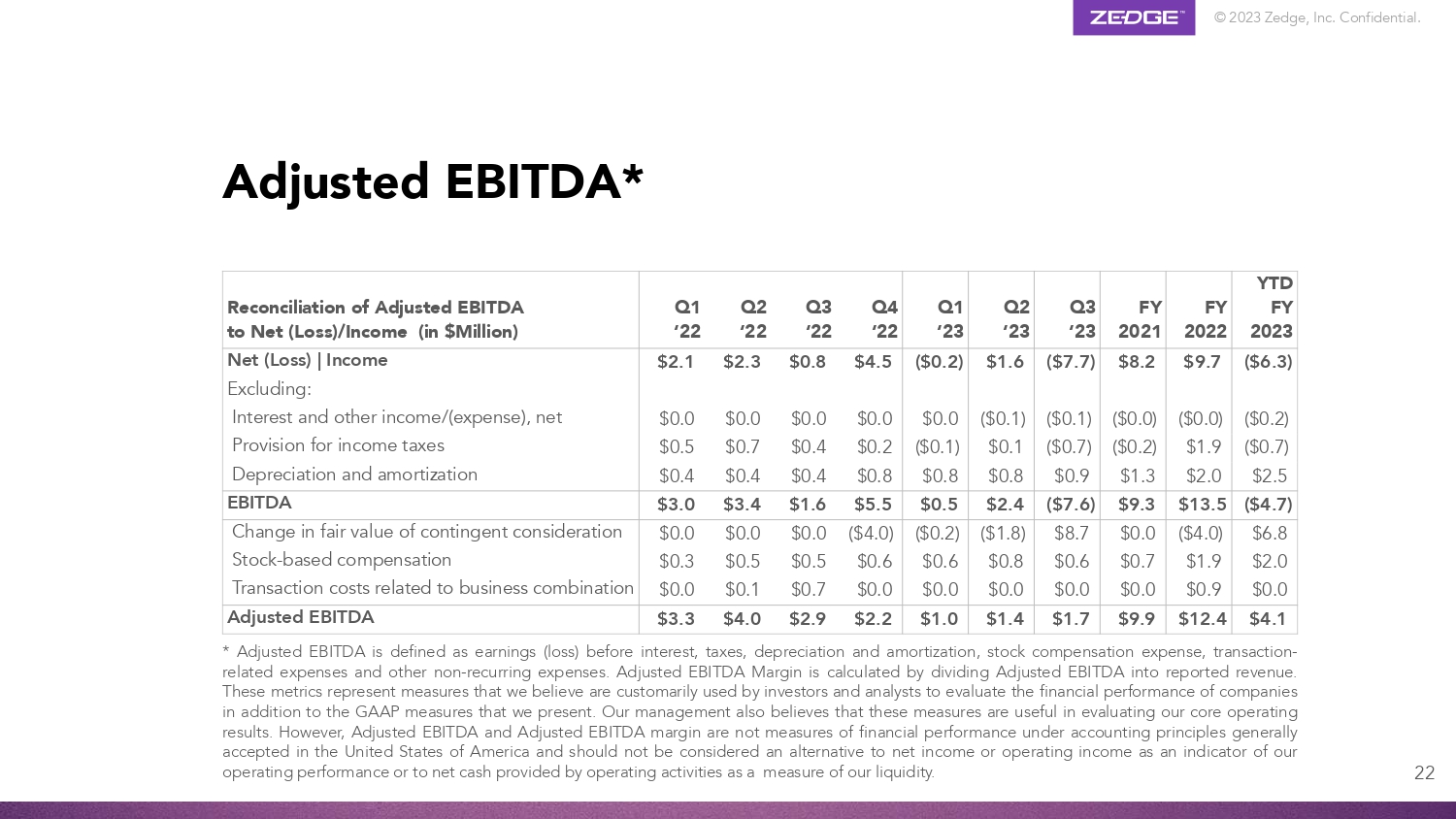 © 2023 Zedge, Inc. Confidential. Adjusted EBITDA* 22 YTD FY 2023 FY 2022 FY 2021 Q3 ‘23 Q2 ‘23 Q1 ‘23 Q4 ‘22 Q3 ‘22 Q2 ‘22 Q1 ‘22 Reconciliation of Adjusted EBITDA to Net (Loss)/Income (in $Million) ($6.3) ($0.2) ($0.7) $2.5 $9.7 ($0.0) $1.9 $2.0 $8.2 ($0.0) ($0.2) $1.3 ($7.7) ($0.1) ($0.7) $0.9 $1.6 ($0.1) $0.1 $0.8 ($0.2) $0.0 ($0.1) $0.8 $4.5 $0.0 $0.2 $0.8 $0.8 $0.0 $0.4 $0.4 $2.3 $0.0 $0.7 $0.4 $2.1 $0.0 $0.5 $0.4 Net (Loss) | Income Excluding: Interest and other income/(expense), net Provision for income taxes Depreciation and amortization ($4.7) $13.5 $9.3 ($7.6) $2.4 $0.5 $5.5 $1.6 $3.4 $3.0 EBITDA $6.8 $2.0 $0.0 ($4.0) $1.9 $0.9 $0.0 $0.7 $0.0 $8.7 $0.6 $0.0 ($1.8) $0.8 $0.0 ($0.2) $0.6 $0.0 ($4.0) $0.6 $0.0 $0.0 $0.5 $0.7 $0.0 $0.5 $0.1 $0.0 $0.3 $0.0 Change in fair value of contingent consideration Stock - based compensation Transaction costs related to business combination $4.1 $12.4 $9.9 $1.7 $1.4 $1.0 $2.2 $2.9 $4.0 $3.3 Adjusted EBITDA * Adjusted EBITDA is defined as earnings (loss) before interest, taxes, depreciation and amortization, stock compensation expense, transaction - related expenses and other non - recurring expenses . Adjusted EBITDA Margin is calculated by dividing Adjusted EBITDA into reported revenue . These metrics represent measures that we believe are customarily used by investors and analysts to evaluate the financial performance of companies in addition to the GAAP measures that we present . Our management also believes that these measures are useful in evaluating our core operating results . However, Adjusted EBITDA and Adjusted EBITDA margin are not measures of financial performance under accounting principles generally accepted in the United States of America and should not be considered an alternative to net income or operating income as an indicator of our operating performance or to net cash provided by operating activities as a measure of our liquidity .