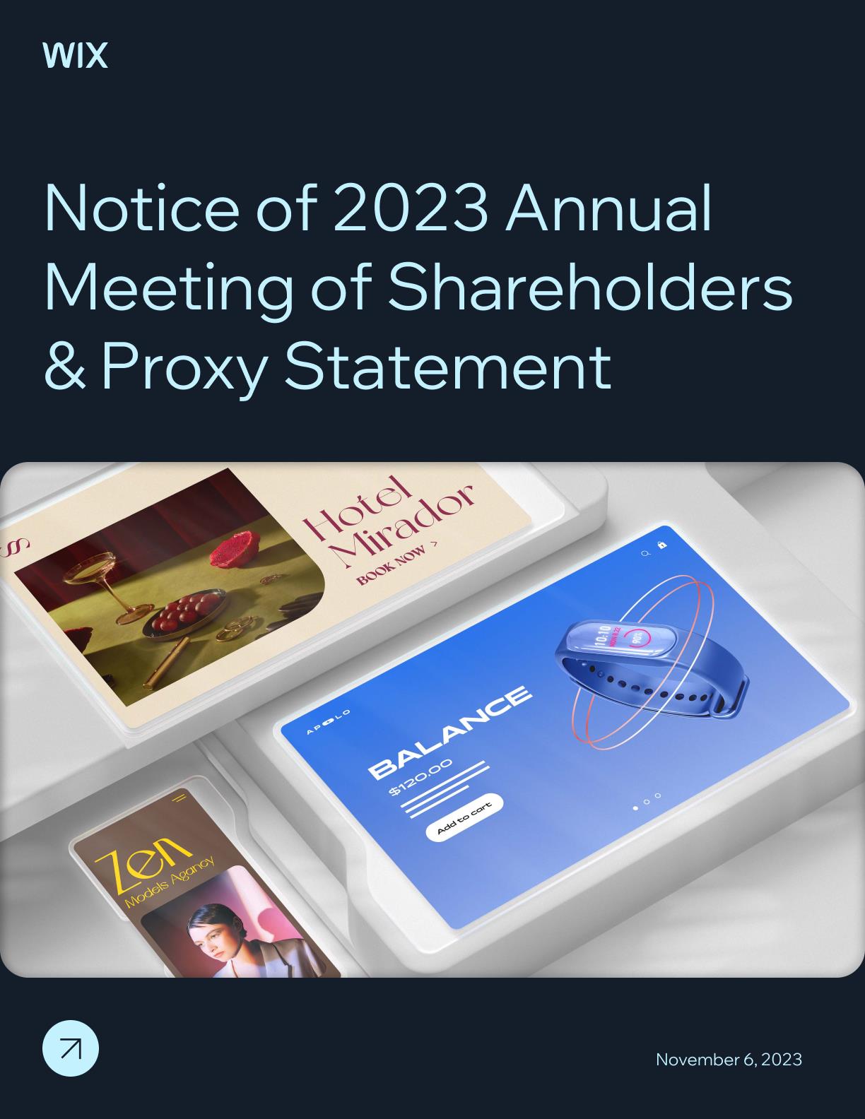 An Annual General Meeting of Shareholders of Wix.com Ltd. (NASDAQ: WIX) (“Wix,” the “Company,” “we” or “our”), will be held on Monday, November 6, 2023 at 1:30 p.m. (Israel time), at our principal executive offices at the Wix Campus, Building B, 5th Floor,