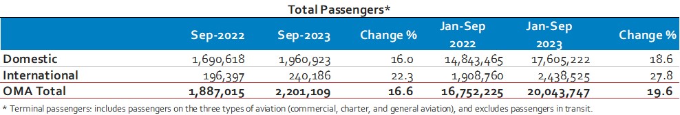 OMA reports a 16.6% increase in September 2023 passenger traffic |