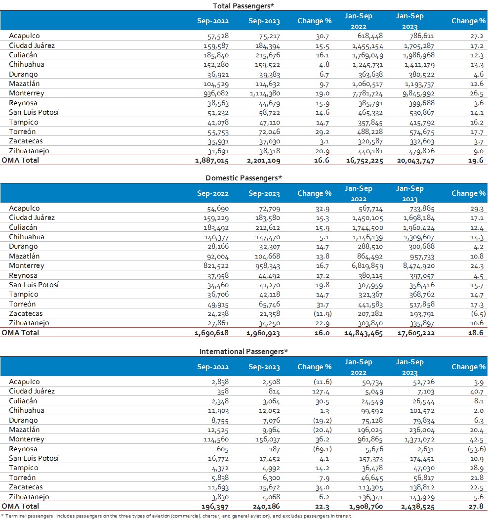 Mexico City, Mexico, October 4, 2023—Mexican airport operator Grupo Aeroportuario del Centro Norte, S.A.B. de C.V., known as OMA (NASDAQ: OMAB; BMV: OMA), reports that terminal passenger traffic at its 13 airports increased 16.6% in September 2023, as compared to September 2022. Domestic traffic increased 16.0%, and international traffic increased 22.3%.