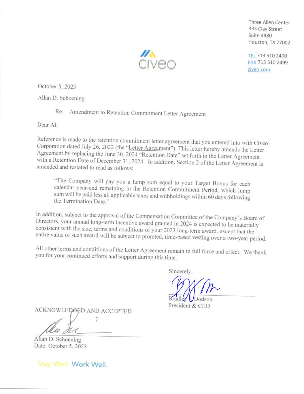 On October 5, 2023, Civeo Corporation (the “Company”) entered into an amendment (the “Amendment”) to the Retention Commitment Agreement, dated July 26, 2022, previously entered into with Allan D. Schoening, the Company’s Senior Vice President, Canada (as so amended, the “Agreement”). The Amendment extends the Retention Date (as defined in the Agreement) from June 30, 2024 to December 31, 2024 and provides that Mr. Schoening will receive his full, non-prorated target bonus for the 2024 bonus period if Mr. Schoening is terminated without Cause prior to the Retention Date.