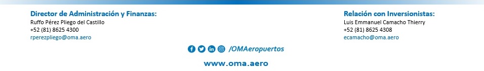 Grupo Aeroportuario del Centro Norte, S.A.B. de C.V., known as OMA, operates 13 international airports in nine states of central and northern Mexico. OMA’s airports serve Monterrey, Mexico’s third largest metropolitan area, the tourist destinations of Acapulco, Mazatlán, and Zihuatanejo, and nine other regional centers and border cities. OMA also operates the NH Collection Hotel inside Terminal 2 of the Mexico City airport and the Hilton Garden Inn at the Monterrey airport. OMA employs over 1,200 persons in order to offer passengers and clients airport and commercial services in facilities. OMA is listed on the Mexican Stock Exchange (OMA) and on the NASDAQ Global Select Market (OMAB). For more information, visit: