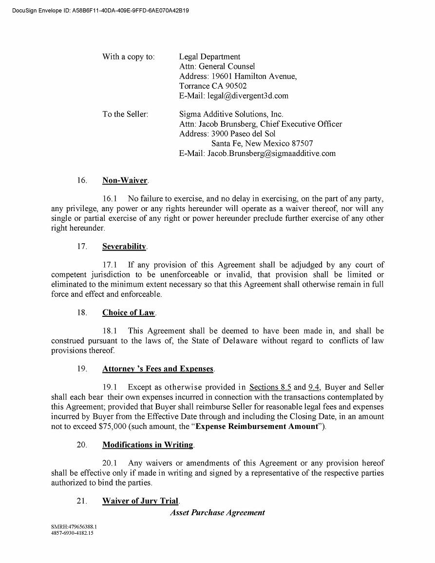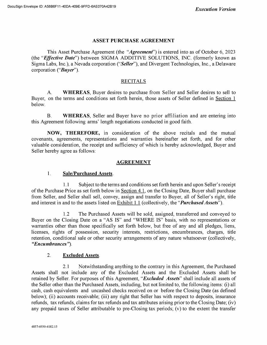 | 10.1 | Asset Purchase Agreement dated as of October 6, 2023 between Sigma Additive Solutions, Inc. and Divergent Technologies, Inc. | |