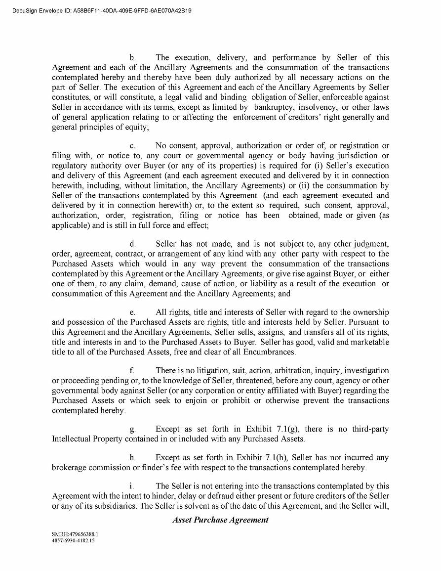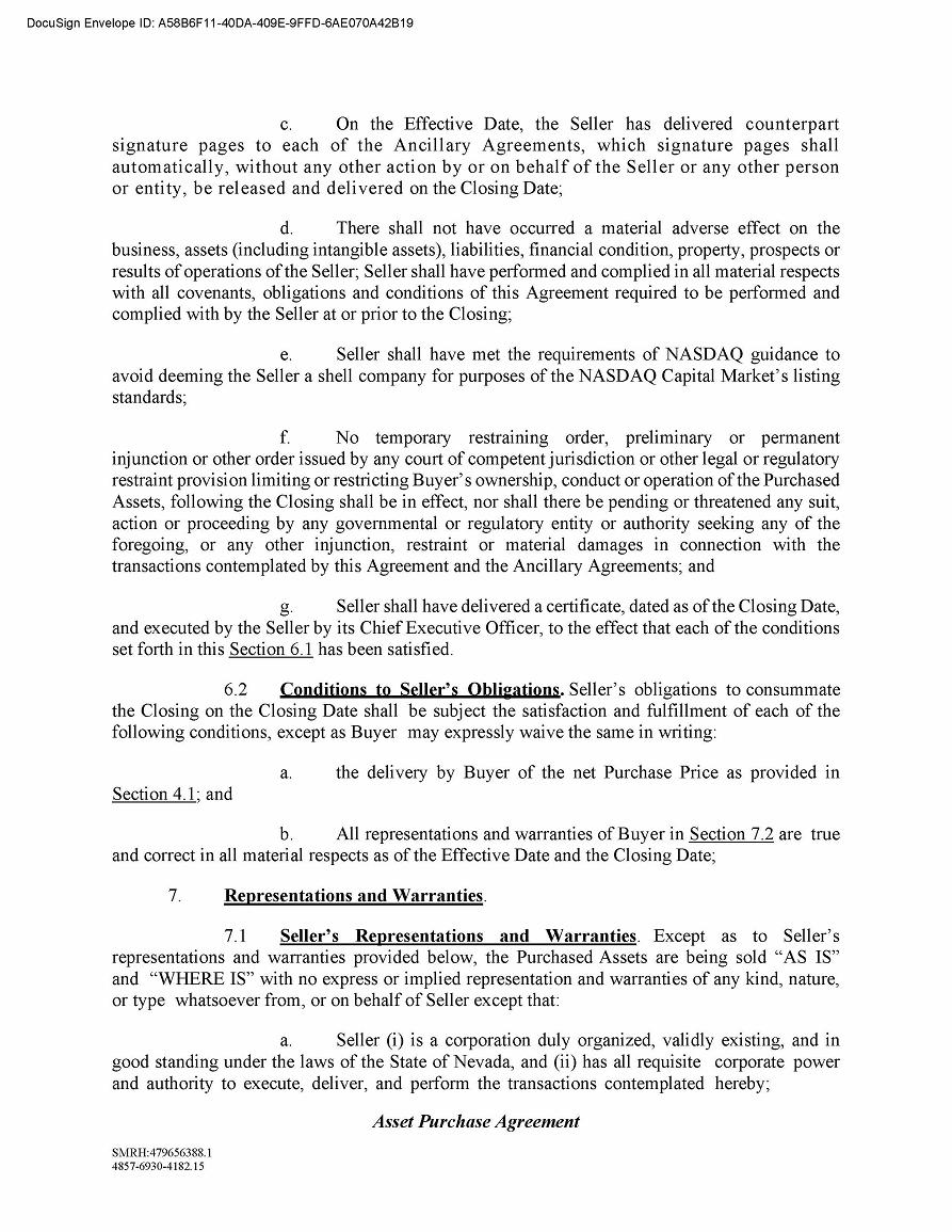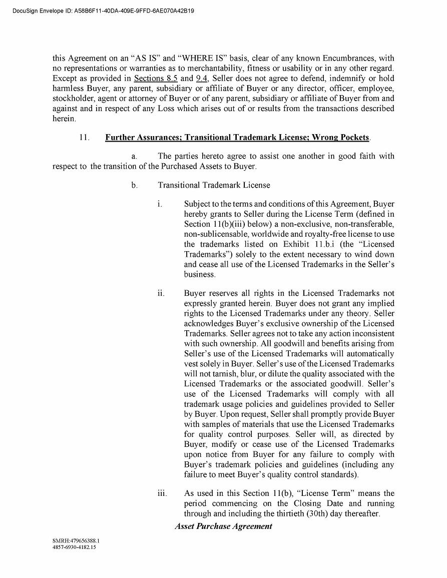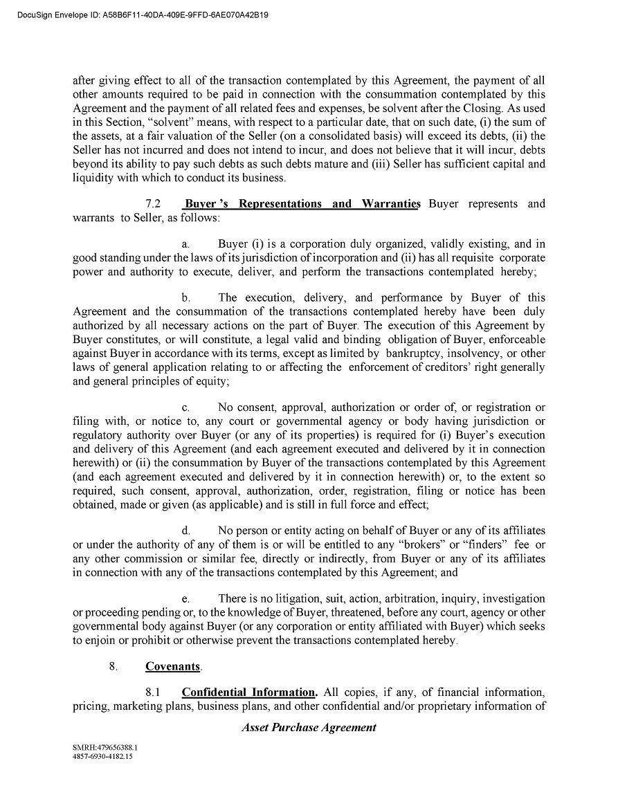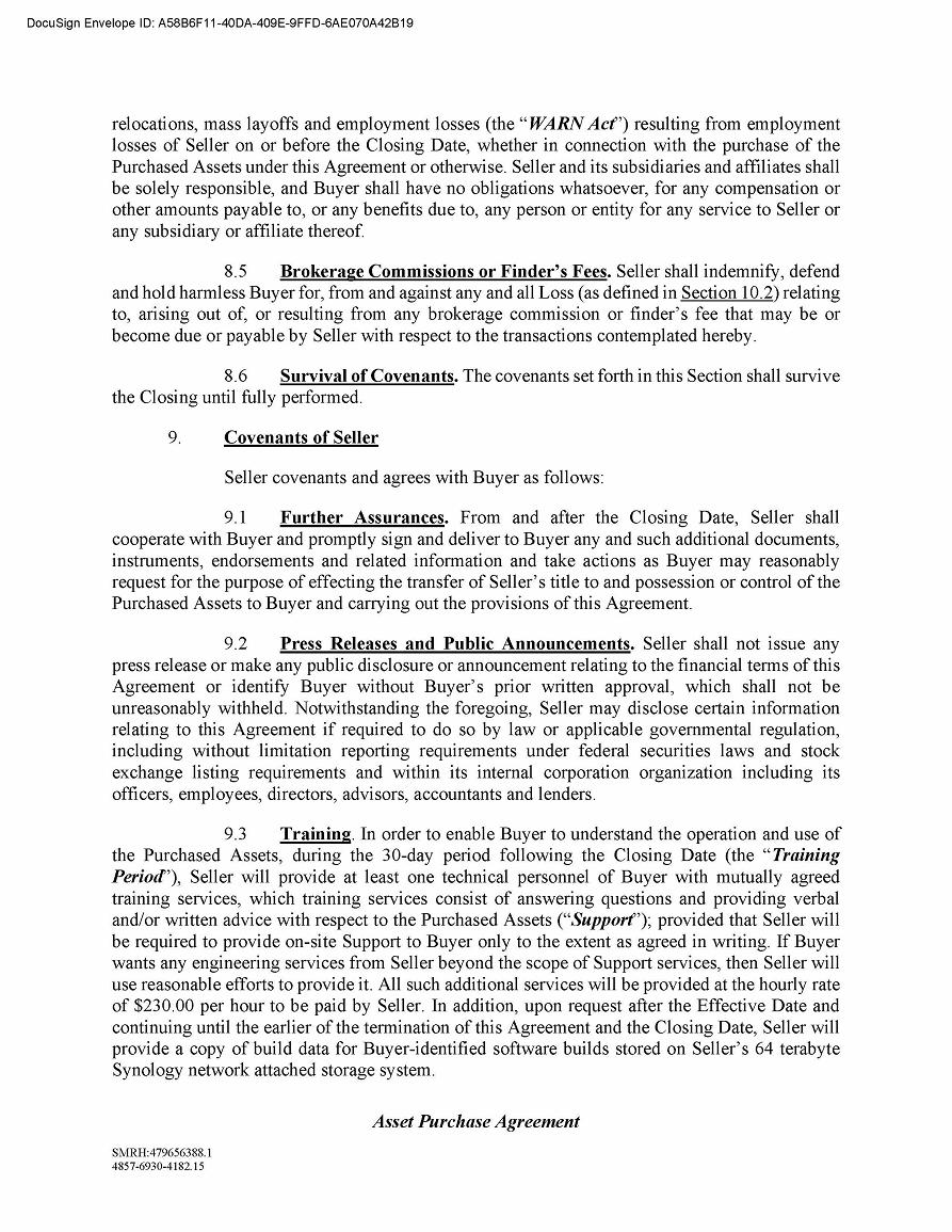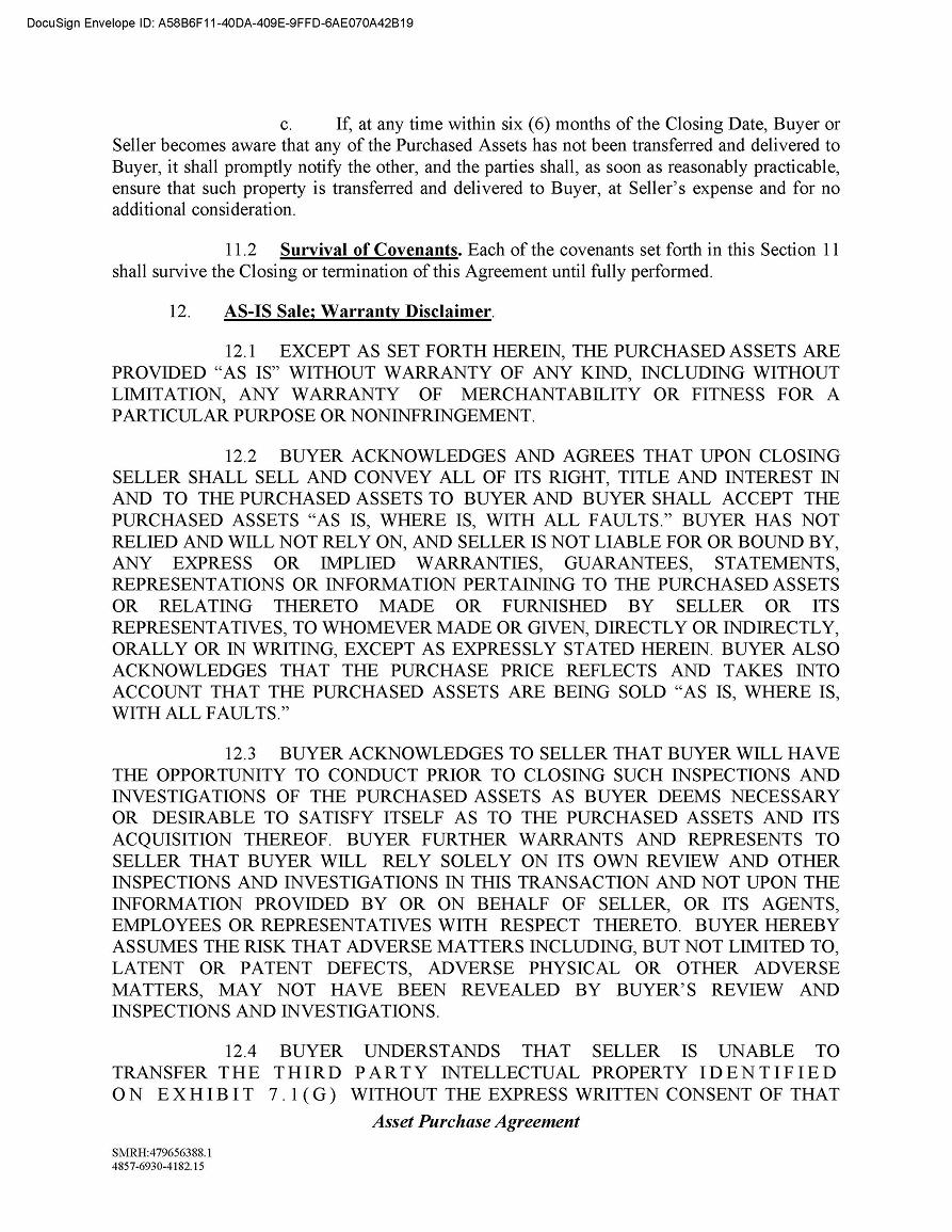 The Asset Purchase Agreement contains customary representations and warranties which will survive for one year following the closing. The Asset Purchase Agreement also contains restrictive covenants regarding the conduct of our business pending the closing.