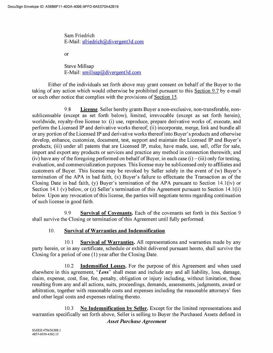 In the interim, between the signing date and closing date or termination of the Asset Purchase Agreement, we have granted Divergent a non-exclusive, non-transferable, non-sublicensable (except to Divergent customers and affiliates), limited, irrevocable (except in connection with the termination of the Asset Purchase Agreement in certain circumstances as described below), worldwide, royalty-free license to the “Licensed IP” (as defined) for testing, evaluation, and commercialization purposes.