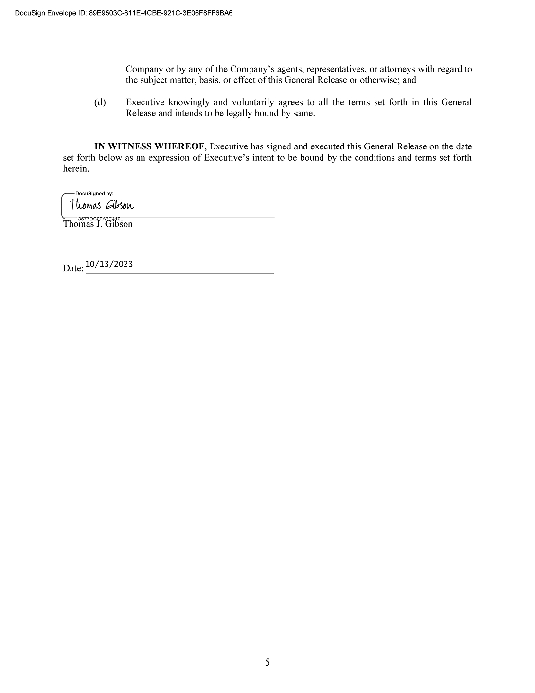 | 10.1 | General Release, dated October 13, 2023, by and between the Company and Thomas J. Gibson. | |