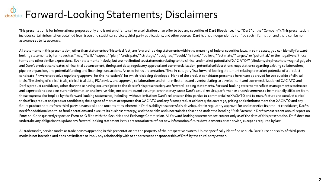 Daré cautions you that all statements, other than statements of historical facts, contained in this press release, are forward-looking statements. Forward-looking statements, in some cases, can be identified by terms such as “believe,” “may,” “will,” “estimate,” “continue,” “anticipate,” “design,” “intend,” “expect,” “could,” “plan,” “potential,” “predict,” “seek,” “should,” “would,” “contemplate,” “project,” “target,” “objective,” or the negative version of these words and similar expressions. In this press release, forward-looking statements include, but are not limited to, statements relating to receipt of payments under Daré’s license agreement with Organon. Forward-looking statements involve known and unknown risks, uncertainties and other factors that may cause Daré’s actual results, performance or achievements to be materially different from those expressed or implied by the forward-looking statements in this press release, including, without limitation: the risks that milestones under the agreement with Organon may not be achieved and milestone payments received, if any, may be significantly less than the potential total amount; the potential for royalty payments to be subject to reductions and offsets; the potential for payments under the license agreement with Organon to become subject to dispute and not received in the amount or on the timeline anticipated; dependence on Organon to commercialize licensed products and on other third parties for commercial supplies of licensed products and components and Daré’s lack of control over the efforts and resources expended by those third parties; Daré’s ability to raise additional capital when and as needed to support its operations, execute its business strategy and continue as a going concern; general industry conditions and competition; the effects of macroeconomic conditions such as inflation, rising interest rates and geopolitical events on Daré’s operations, financial results and condition, and ability to achieve current plans and objectives; the impact of pharmaceutical industry regulation and health care legislation in the United States and internationally; the risk that developments by competitors make Daré’s product or product candidates less competitive or obsolete; difficulties establishing and sustaining relationships with development and/or commercial collaborators; failure of Daré’s product or product candidates, if approved, to gain market acceptance or obtain adequate coverage or reimbursement from third-party payers; Daré’s ability to retain its licensed rights to develop and commercialize a product or product candidate; Daré’s ability to satisfy the monetary obligations and other requirements in connection with its exclusive, in-license agreements covering the critical patents and related intellectual property related to its product and product candidates; Daré’s ability to adequately protect or enforce its, or its licensor’s, intellectual property rights; the lack of patent protection for the active ingredients in certain of Daré’s product candidates which could expose its products to competition from other formulations using the same active ingredients; product liability claims; governmental investigations or actions relating to Daré’s product or product candidates or the business activities of Daré, its commercial collaborators or other third parties on which Daré relies; the impact of pharmaceutical industry regulation and health care legislation in the United States and internationally; global trends toward health care cost containment; cybersecurity incidents or similar events that compromise Daré’s technology systems or those of third parties on which it relies and/or significantly disrupt Daré’s business; and disputes or other developments concerning Daré’s intellectual property rights. Daré’s forward-looking statements are based upon its current expectations and involve assumptions that may never materialize or may prove to be incorrect. All forward-looking statements are expressly qualified in their entirety by these cautionary statements. For a detailed description of Daré’s risks and uncertainties, you are encouraged to review its documents filed with the SEC including Daré’s recent filings on Form 8-K, Form 10-K and Form 10-Q. You are cautioned not to place undue reliance on forward-looking statements, which speak only as of the date on which they were made. Daré undertakes no obligation to update such statements to reflect events that occur or circumstances that exist after the date on which they were made, except as required by law.