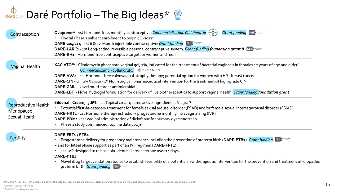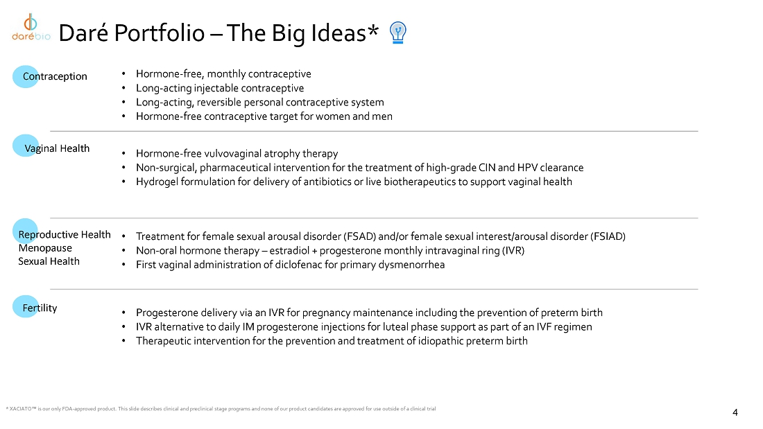 Daré’s first FDA-approved product, XACIATO™ (clindamycin phosphate) vaginal gel, 2% is a lincosamide antibacterial indicated for the treatment of bacterial vaginosis in female patients 12 years of age and older, which is under a global license agreement with Organon. Daré’s portfolio also includes potential first-in-category candidates in clinical development: Ovaprene®, a novel, hormone-free monthly intravaginal contraceptive whose U.S. commercial rights are under a license agreement with Bayer; Sildenafil Cream, 3.6%, a novel cream formulation of sildenafil to treat female sexual arousal disorder (FSAD) and/or female sexual interest/arousal disorder (FSIAD) utilizing the active ingredient in Viagra®; and DARE-HRT1, a combination bio-identical estradiol and progesterone intravaginal ring for menopausal hormone therapy. To learn more about XACIATO, Daré’s full portfolio of women’s health product candidates, and Daré’s mission to deliver differentiated therapies for women, please visit www.darebioscience.com.