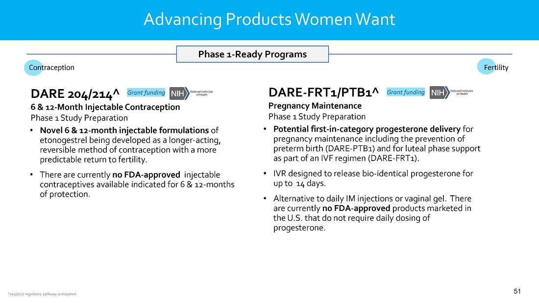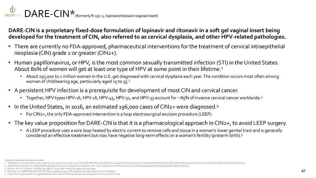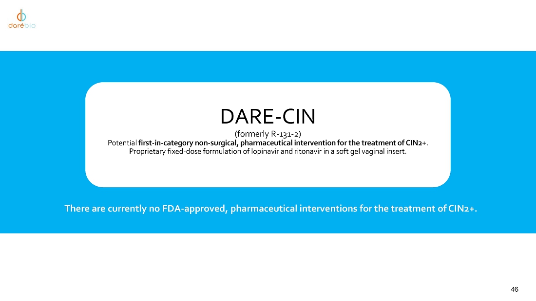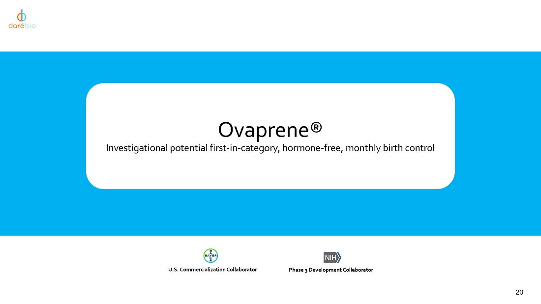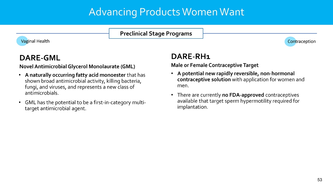 Daré Bioscience is a biopharmaceutical company committed to advancing innovative products for women’s health. The company’s mission is to identify, develop and bring to market a diverse portfolio of differentiated therapies that prioritize women’s health and well-being, expand treatment options, and improve outcomes, primarily in the areas of contraception, vaginal health, reproductive health, menopause, sexual health and fertility.