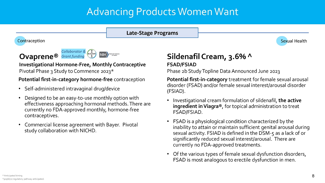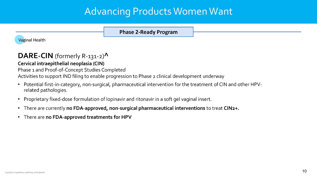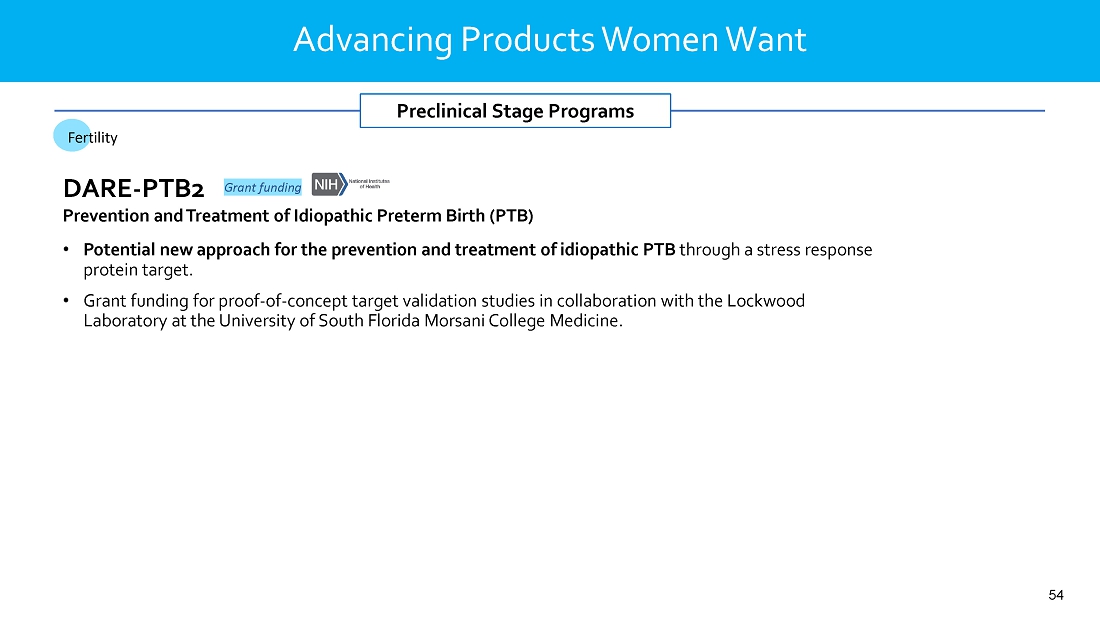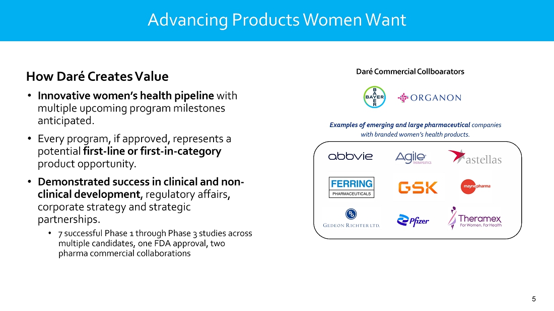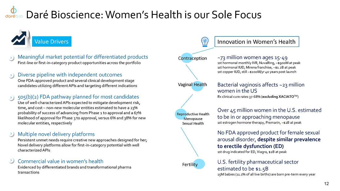 Daré Bioscience is a biopharmaceutical company committed to advancing innovative products for women’s health. The company’s mission is to identify, develop and bring to market a diverse portfolio of differentiated therapies that prioritize women’s health and well-being, expand treatment options, and improve outcomes, primarily in the areas of contraception, vaginal health, reproductive health, menopause, sexual health and fertility.