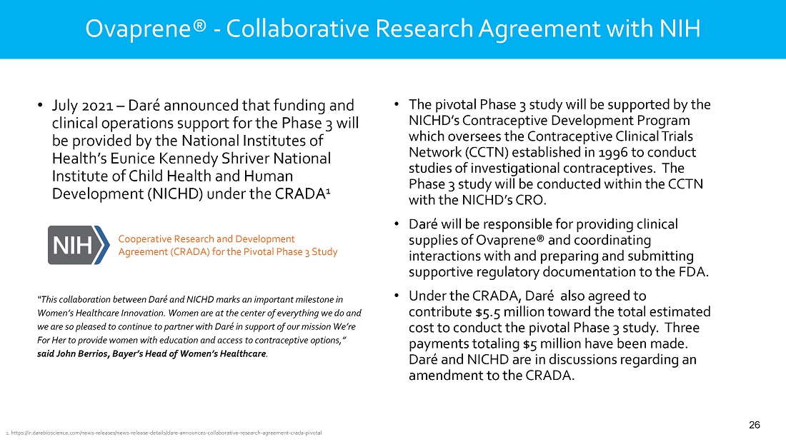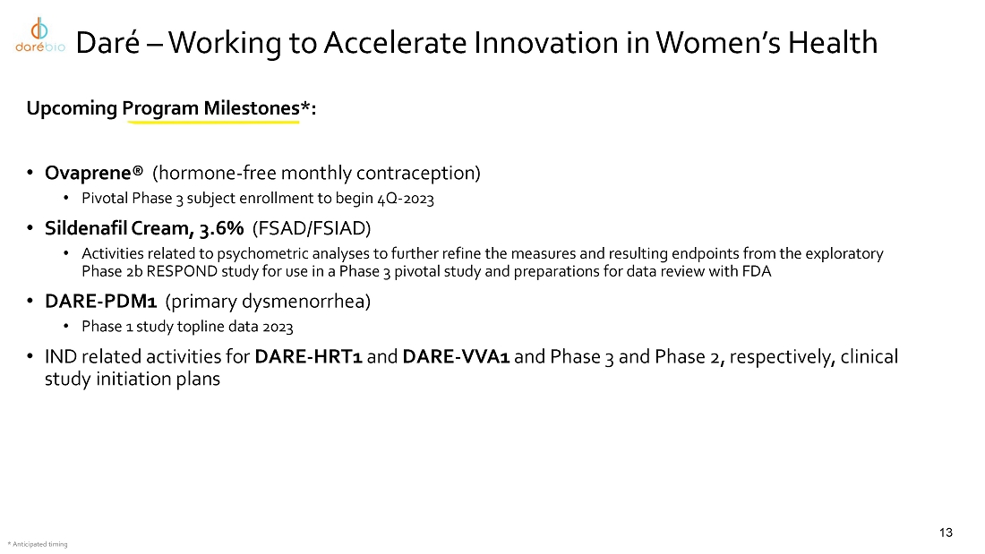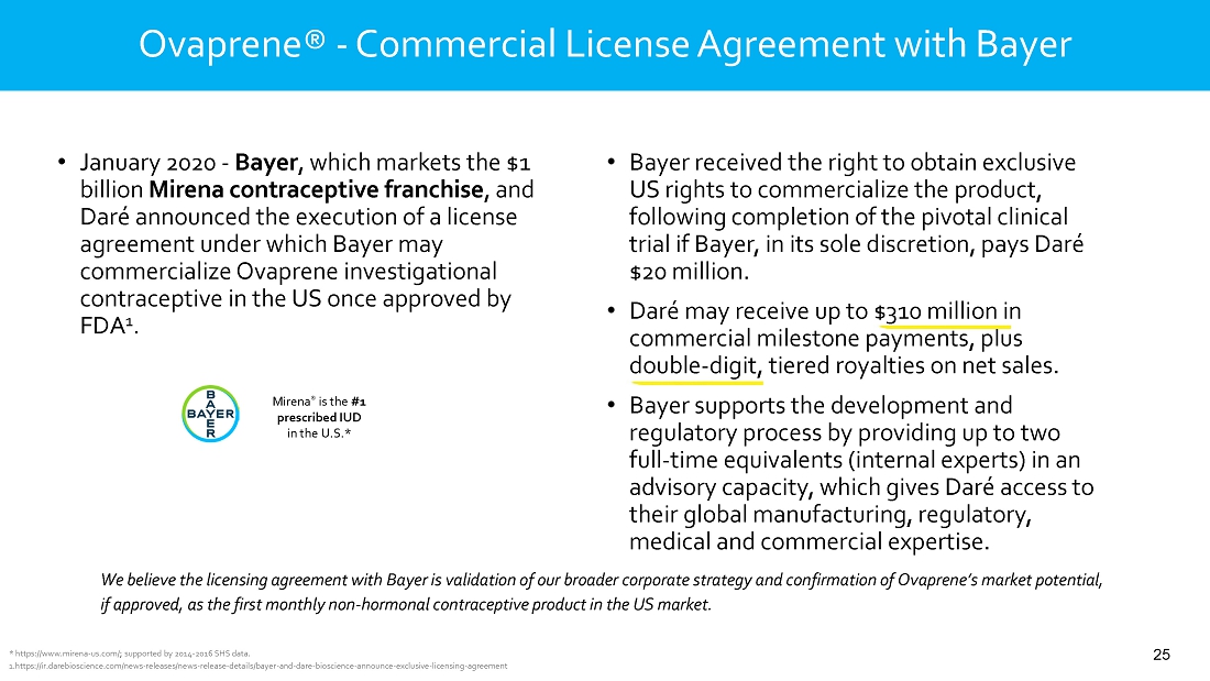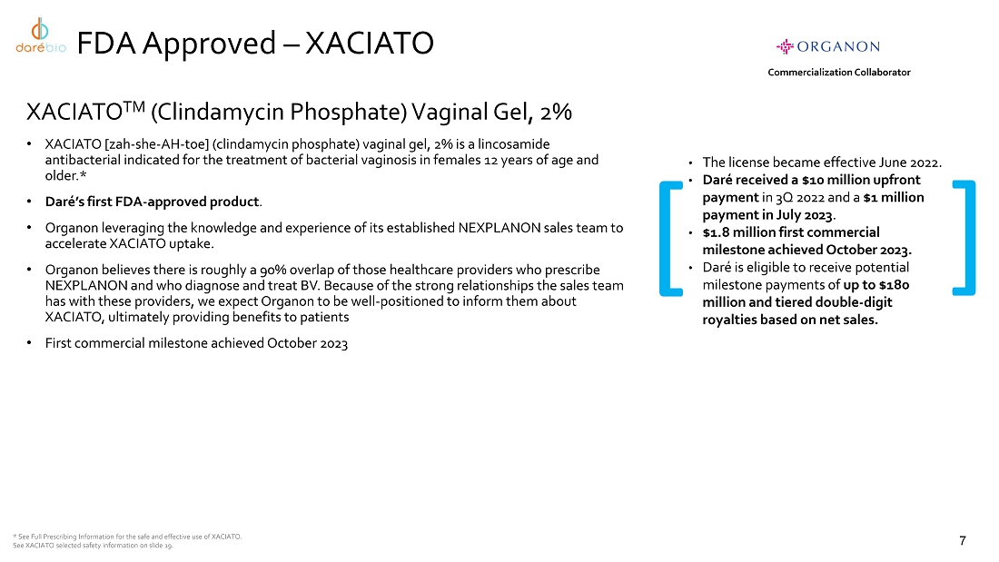 Daré and Organon entered into a global exclusive license agreement for XACIATO in March 2022. Daré received a $10.0 million upfront payment after the license agreement became effective and a $1.0 million payment in July 2023. In addition to the $1.8 million milestone payment, Daré is eligible to receive potential future milestone payments of up to $180 million and tiered double-digit royalties based on net sales.